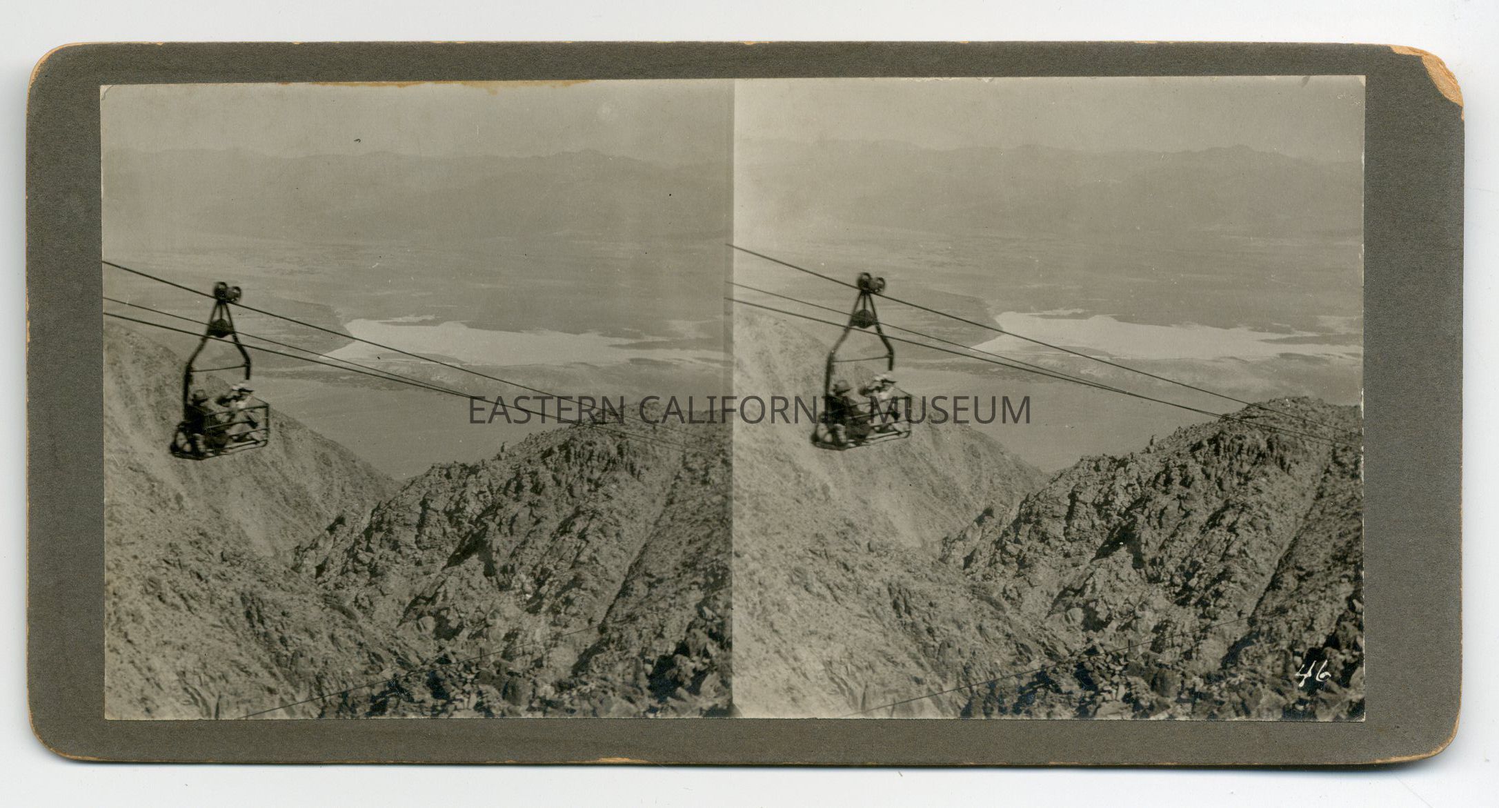 Stereograph of two people riding a bucket (cage?) on the tram in Daisy Canyon between station #9 and station #10. The Saline Valley salt lake is visible in the background. Photographed by Pacific Art Co. of Los Angeles and given their ID #46.
