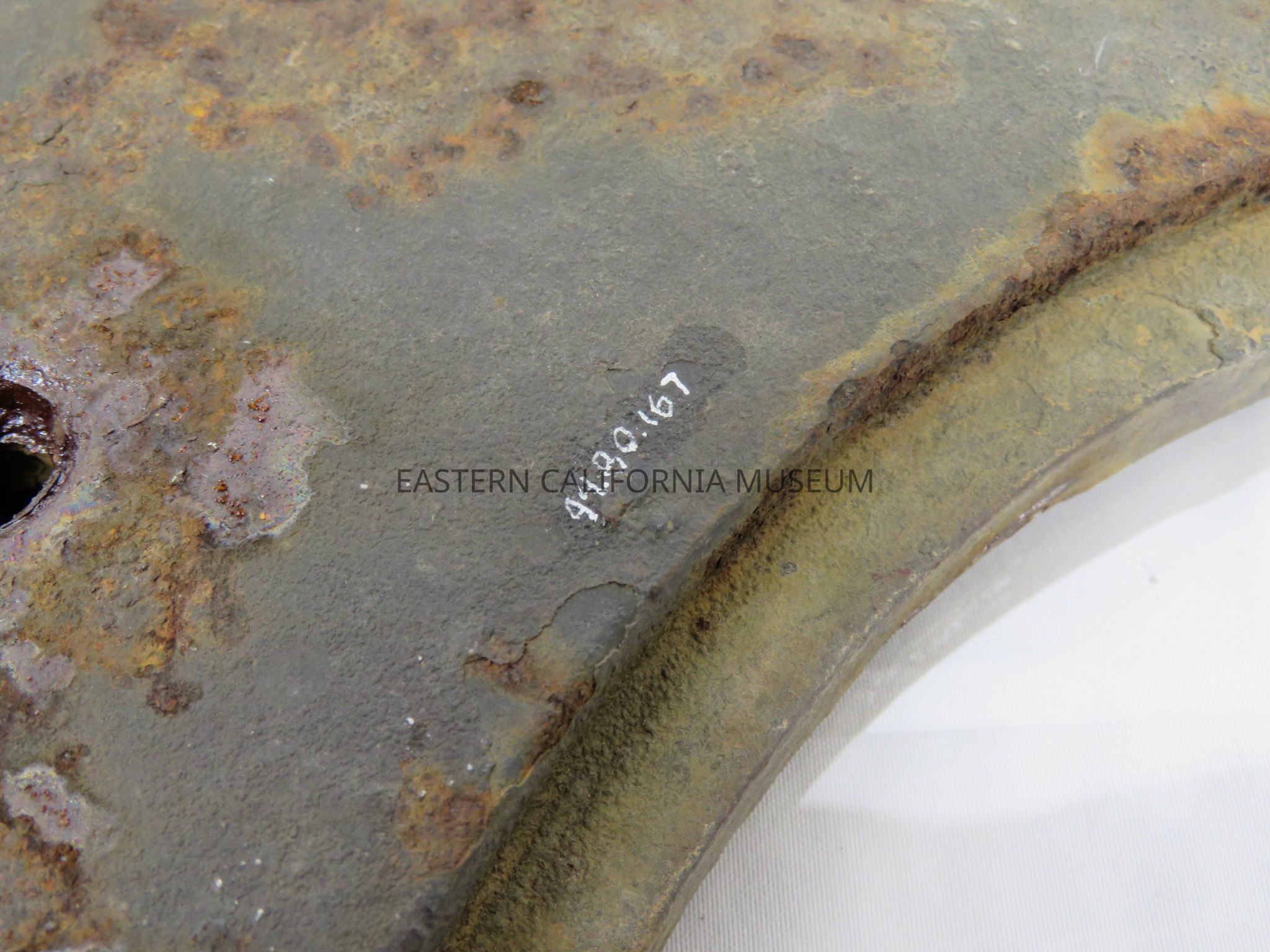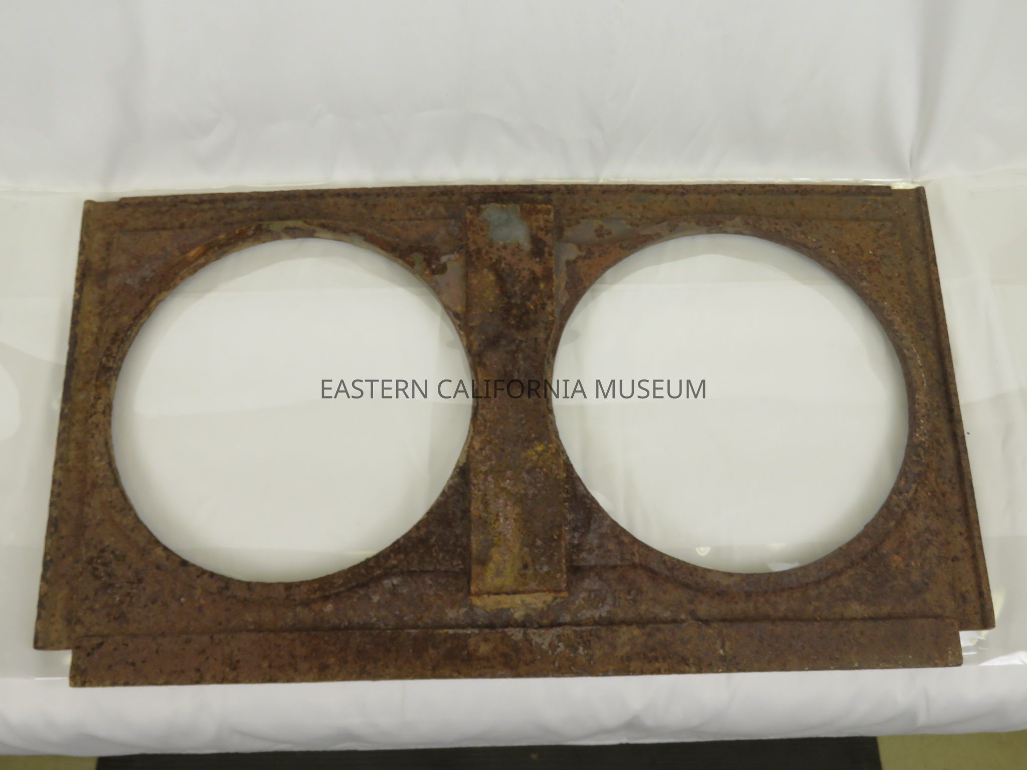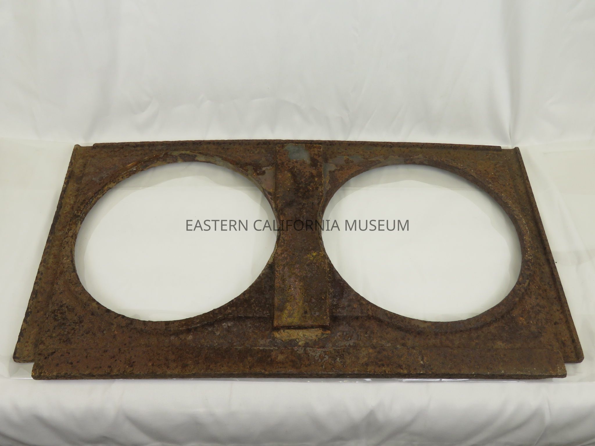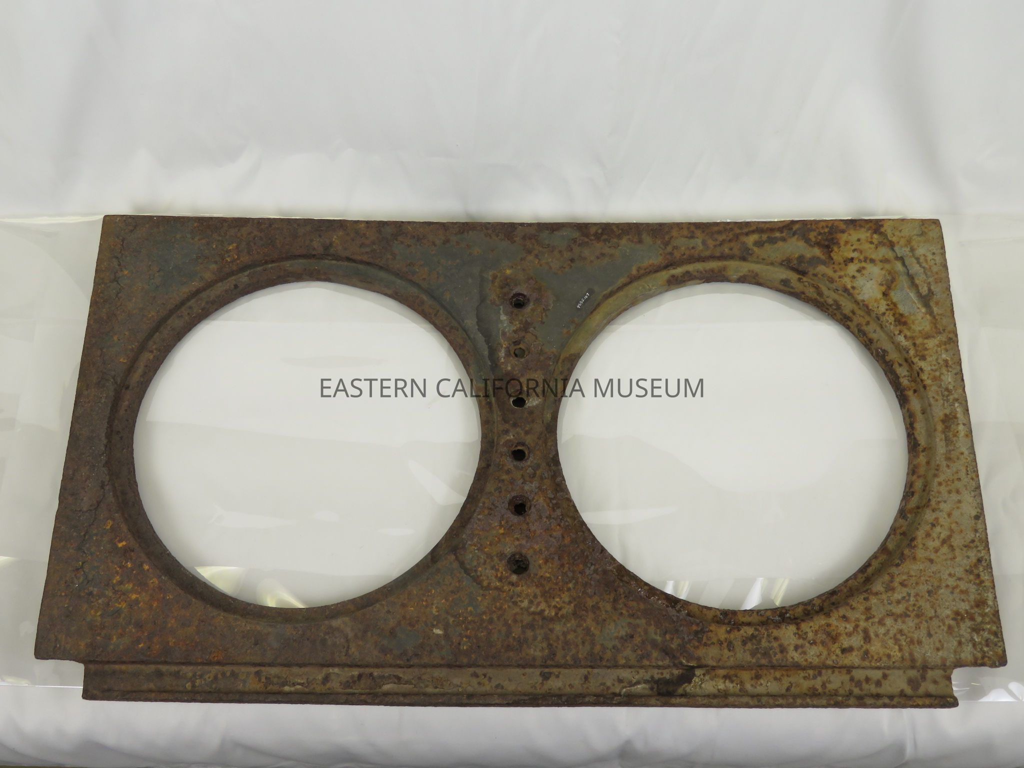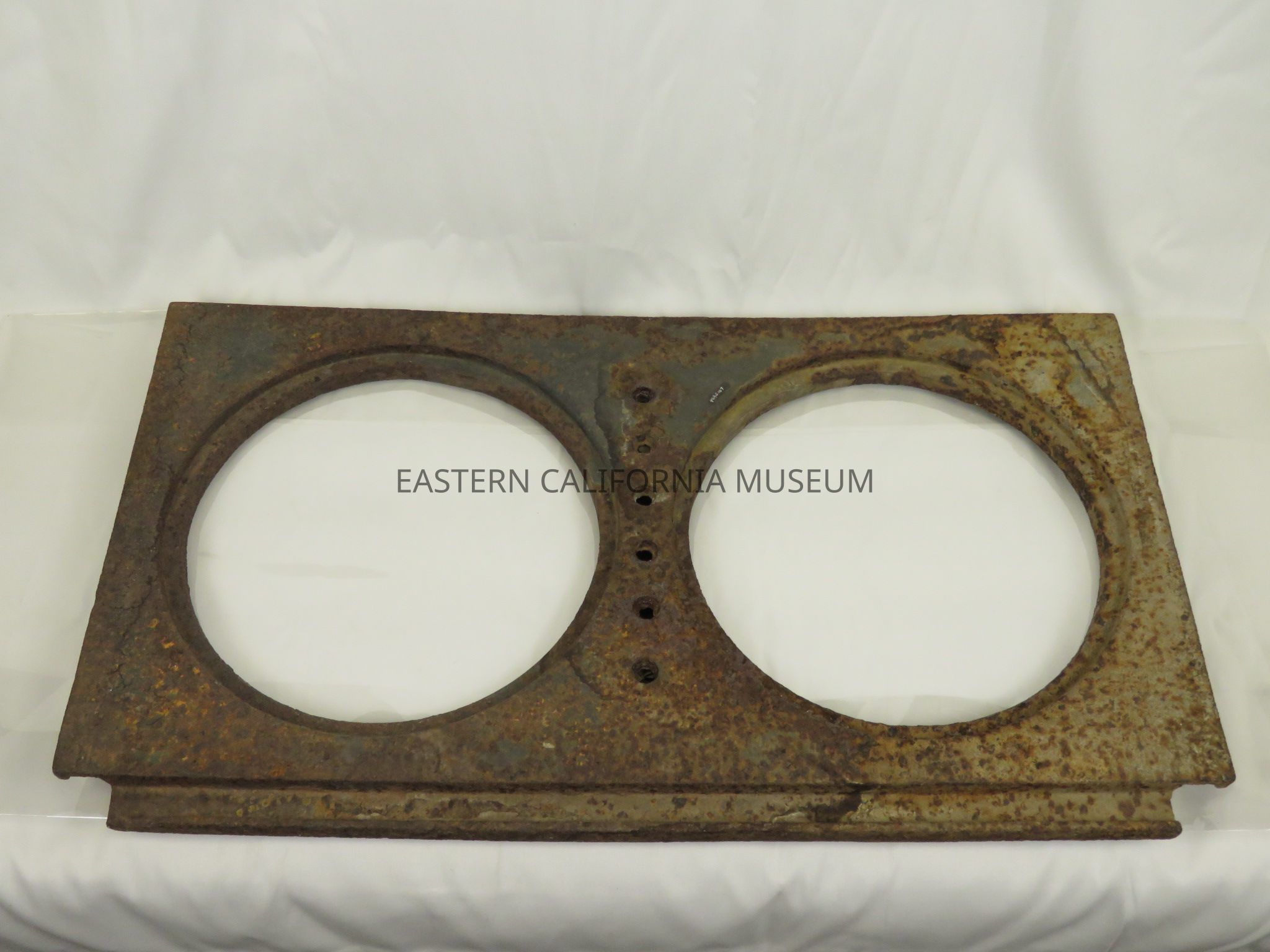 Badly rusted cast iron stove top, likely found at Manzanar. It has two holes of 9.25" in diameter.
