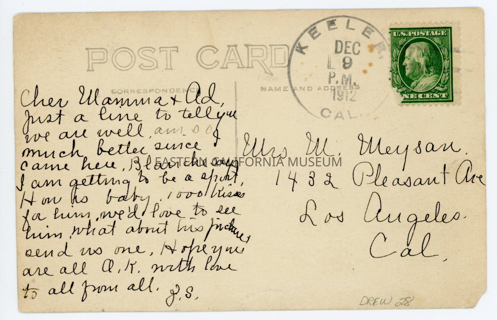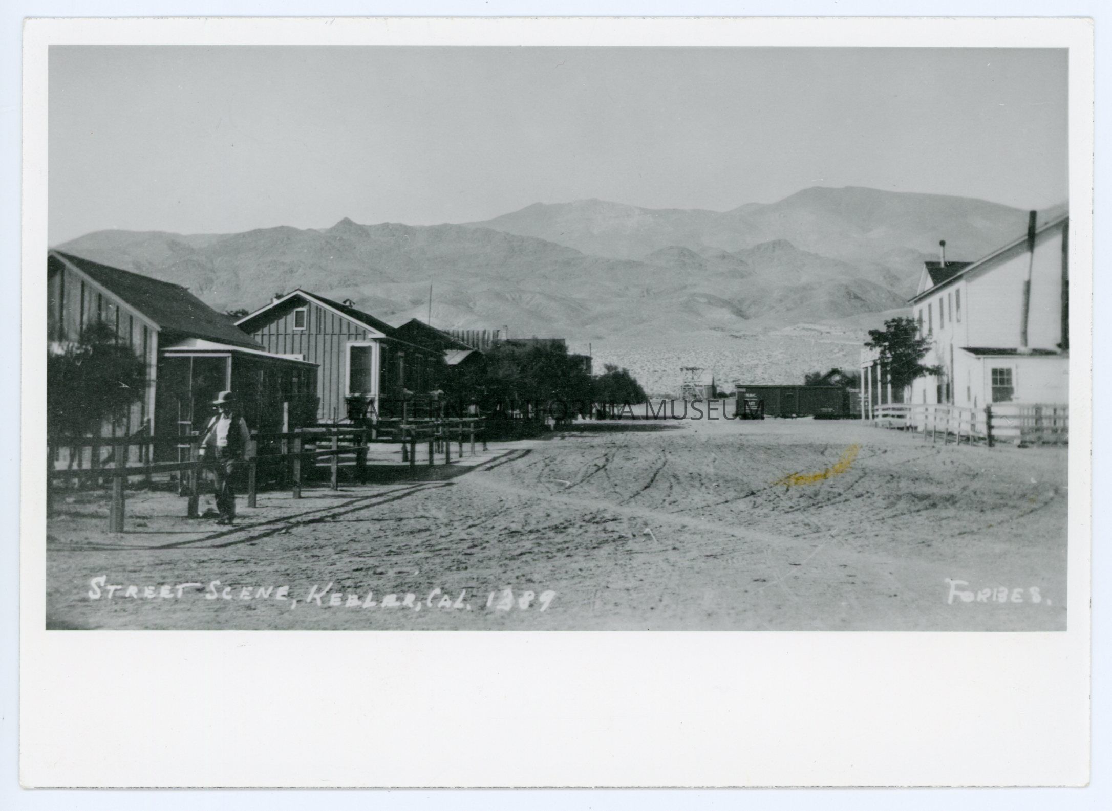 Copy of a photo titled, "Street Scene, Keeler, Cal." taken by photographer Forbes and given his ID #1389. It shows Keeler in 1912 taken from Yerington St. up Malone Ave. The Mates Hotel is on the right. Also visible: Mr. John Lewis, A.T. Smith house and store, depot, tree in front of Boland house.