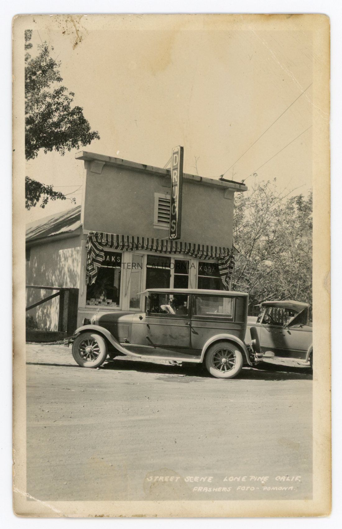 Photo postcard titled, "Street Scene, Lone Pine, Calif." taken by photographer Frasher. It is a photo of two early automobiles parked in front of a Drug store.Collection