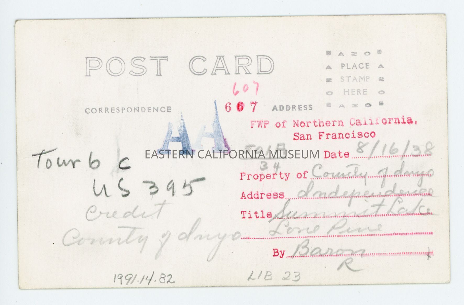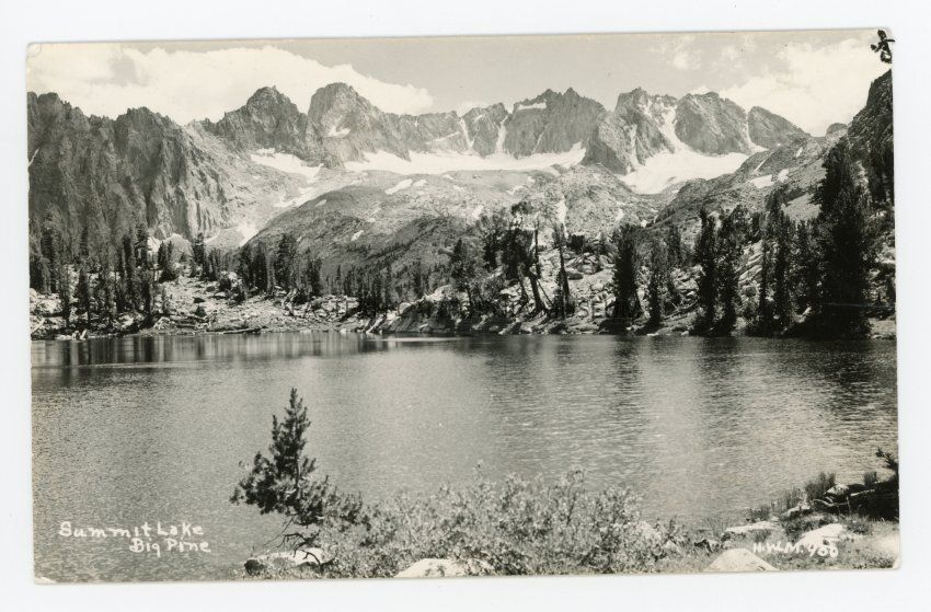 Photo postcard of a lake and mountains. It is labeled, "Summit Lake, Big Pine" and has ID #950.