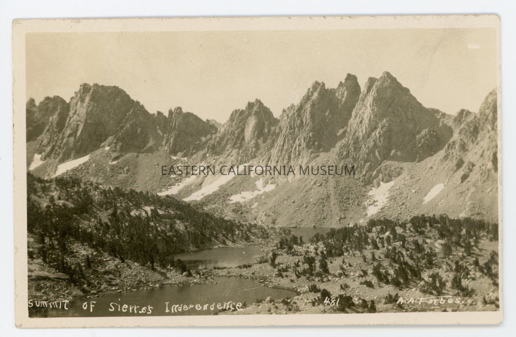 Photo postcard titled, "Summit of Sierras, Independence." It was taken by photographer A. A. Forbes and given his ID #481. It has been identified as the Kearsarge Pass area.Collection