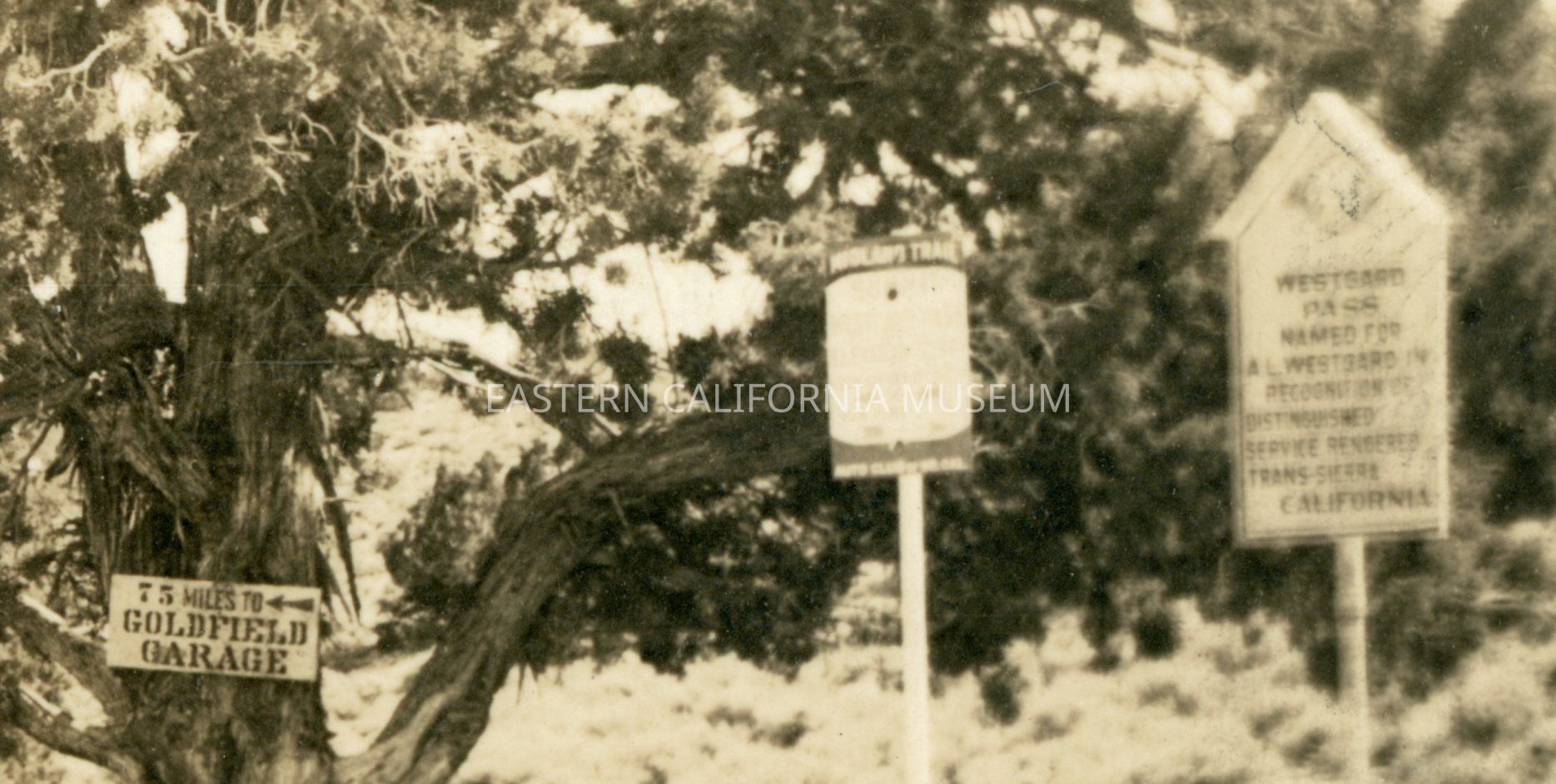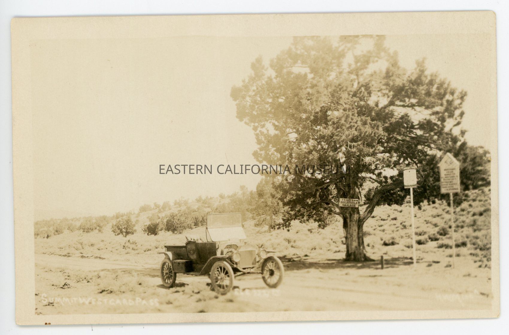 Photo postcard titled, "Summit Westgard Pass, Ele. 7,276 ft." taken by photographer H. W. Mendenhall and given his ID #81a. it shows an early automobile parked by a lone tree with three signs. The sign hanging from the tree says, "75 Miles to Goldfield Garage." The sign in the middle is mostly illegible, but says "Midland Trail / Auto Club of So. Cal." The third sign on the right appears to be an Inyo Good Roads Club sign (like A508.1 and 1975.91.3) and it says, "Westgard Pass named for A. L. Westgard in recognition of distinguished service rendered. Trans-Sierra California."Collection