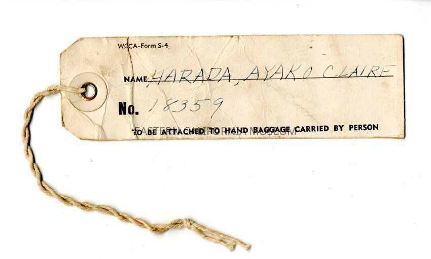 WCCA Form S-4. ID tag for Claire Ayako Harada. Family No. 18359. "To be attached to hand baggage carried by person." On reverse in pencil is: OK--T.S.Collection