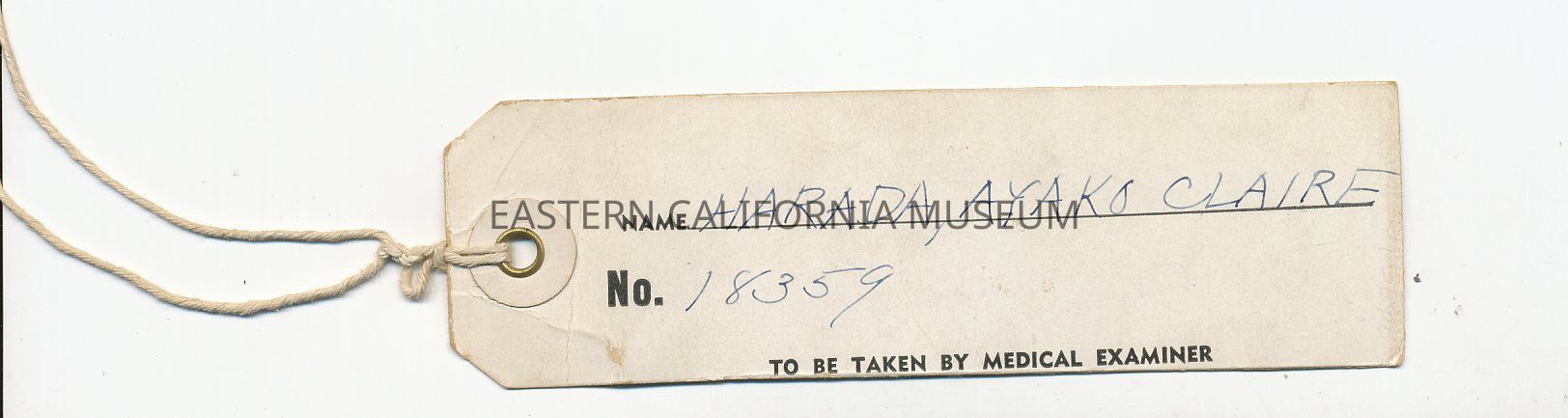 ID tag for Claire Ayako Harada. Family No. 18359. "To be taken by medical examiner." Written on reverse in pencil: OK.Collection