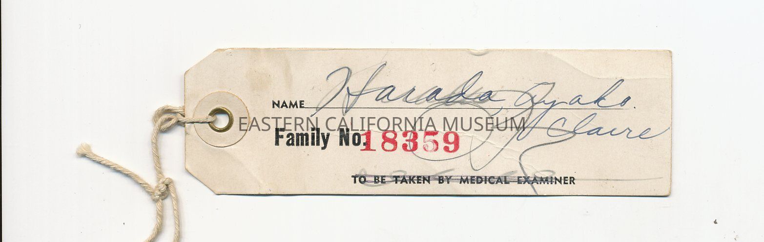 ID tag for Claire Ayako Hanada. Family No. 18359 (in red ink). "To be taken by medical examiner" has been scratched out. Written on reverse in pencil: OK.Collection