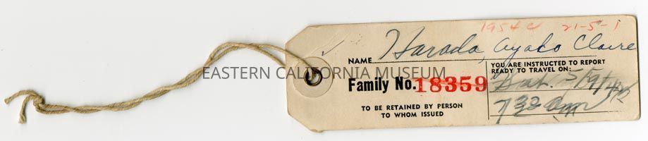 Travel Instruction Tag for Ayako Claire Harada. Family No. 18359. You are instructed to report ready to travel on Sat. 5/9/42 7:30am. To be retained by person to whom issued. There are a few notes in red pencil: "1954c" and "21-5-1."Collection