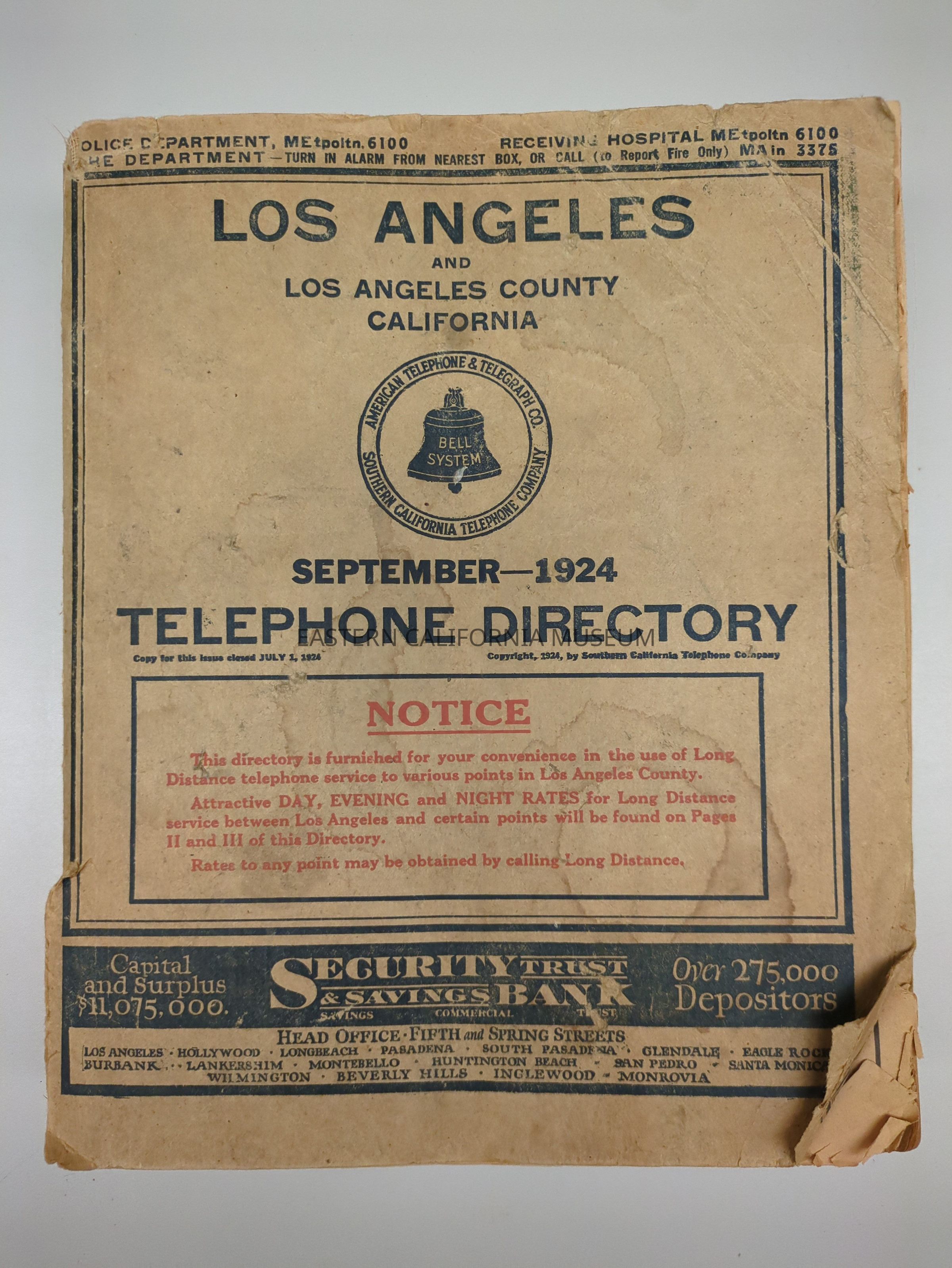 Telephone Directory: Los Angeles and Los Angeles County, California, September 1924. Copyright by the Southern California Telephone Company.