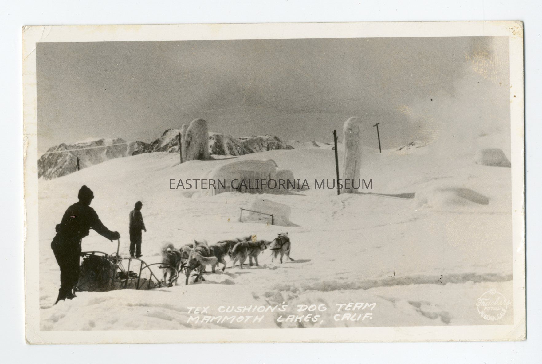 Photo postcard titled, "Tex Cushion's Dog Team, Mammoth Lakes, Calif." it shows two people and a dog sled team in a snowy landscape. Photographer was Burton Frasher of Pomona.