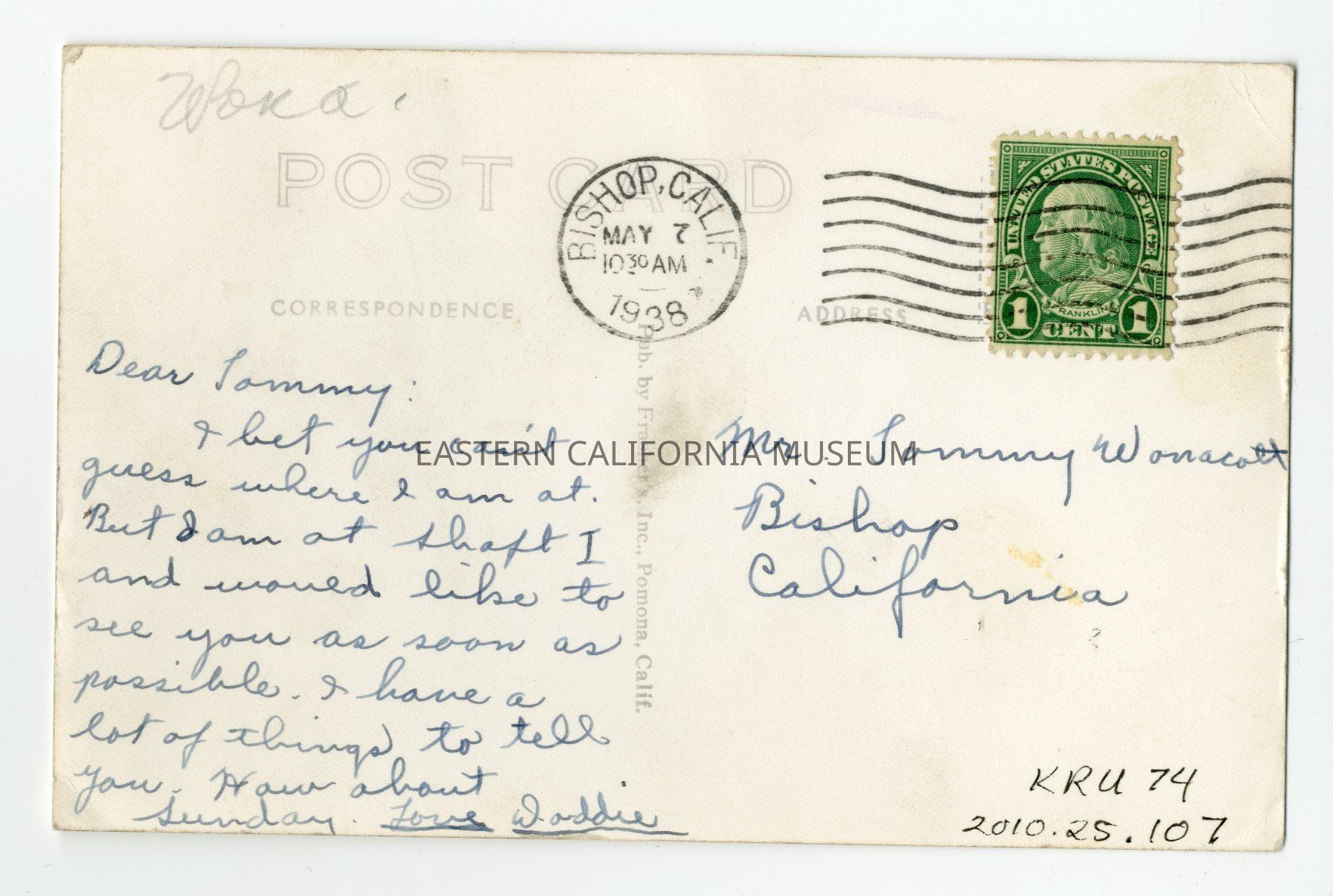 It was sent to Mr. Tommy Wonacott of Bishop from Wadie. It was sent on May 7, 1938 from Bishop using a green one cent Benjamin Franklin stamp.Collection