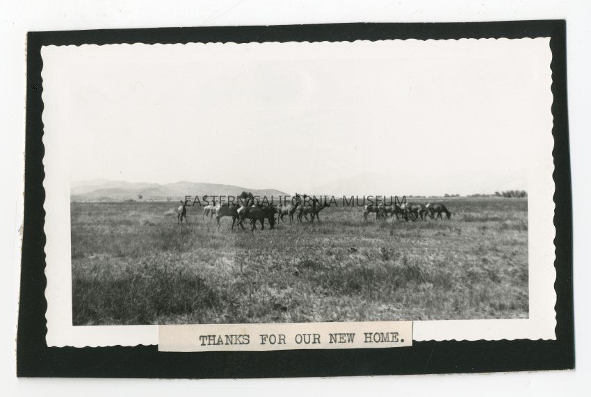Photo of a herd of elk in a field in the Tinnemaha area. The photo is printed on scalloped paper.