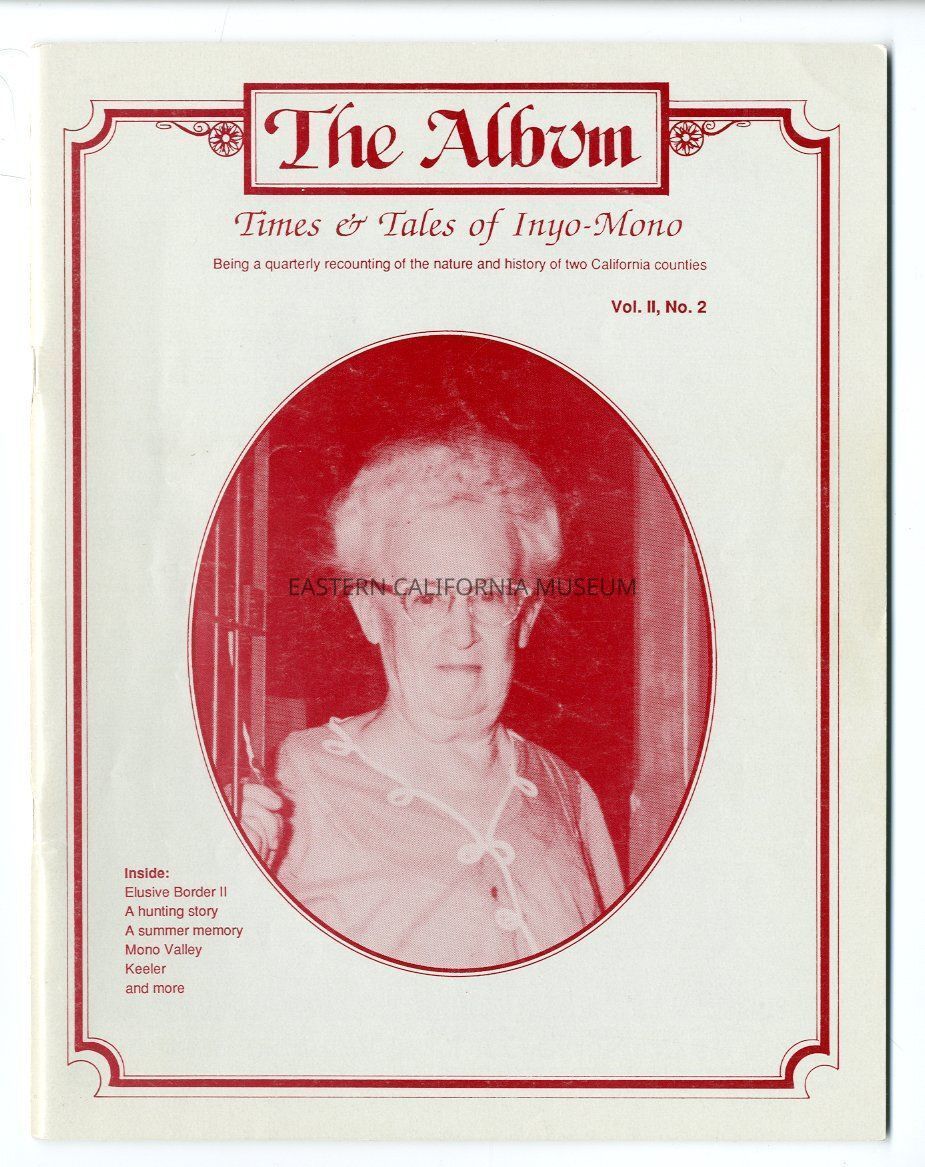 "The Album, Vol. 2, No. 2, April 1989" contains the following articles: The Elusive California Nevada Border Part II, My Mountain is Always Good to Me, The Cabin, A Sentimental Photo Essay, Bits of History to Gnaw On Documents of the Stamp Act, Israel Views Mono Valley, Lillian's Keeler, and A Recipe for Foragers.Publication Details