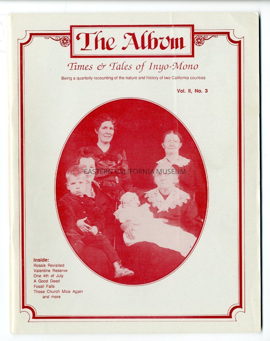 "The Album, Vol. 2, No. 3, July 1989" contains the following articles: Our Trip Acorss the Mojave Desert in a Covered Wagon, Curley and Harriette Rossi Cowboy Poets, The Gold Old Days, Valentine, One Fourth of July, My Good Deed, My Growing Up Years As I Remember Them, Bits of History to Gnaw On an Eye-Witness to the Lincoln Assassination, Fossil Falls and Prehistoric Man, and Home on the Range with the Rossis.Publication Details