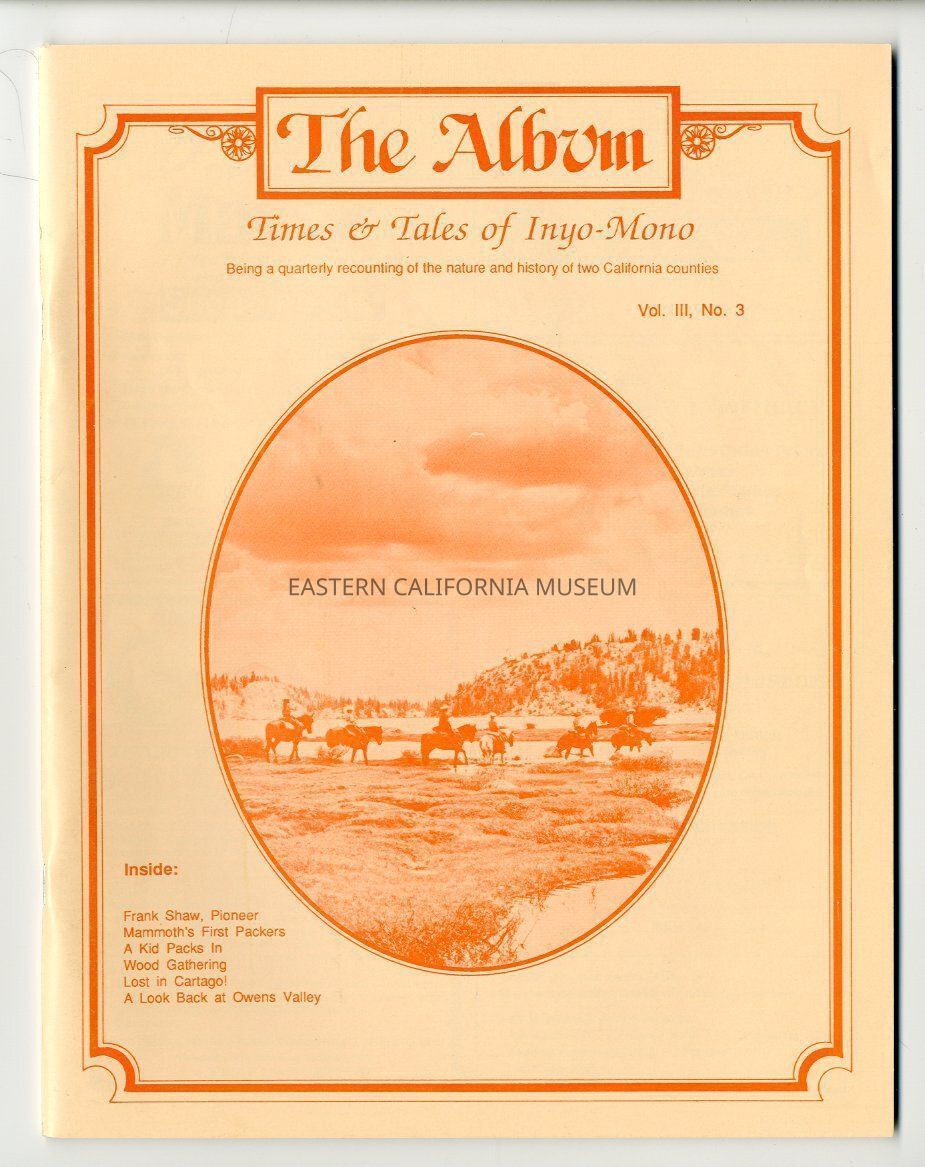 "The Album, Vol. 3, No. 3, July 1990" contains the following articles: Early Packers of Mammoth Lakes, Packin' Back, The Frank Shaw Family Legend Part I, Where Have All the Ranches Gone, Wood for the Home Fires, Lost in Cartago, and Packing 50 Years Ago.Publication Details