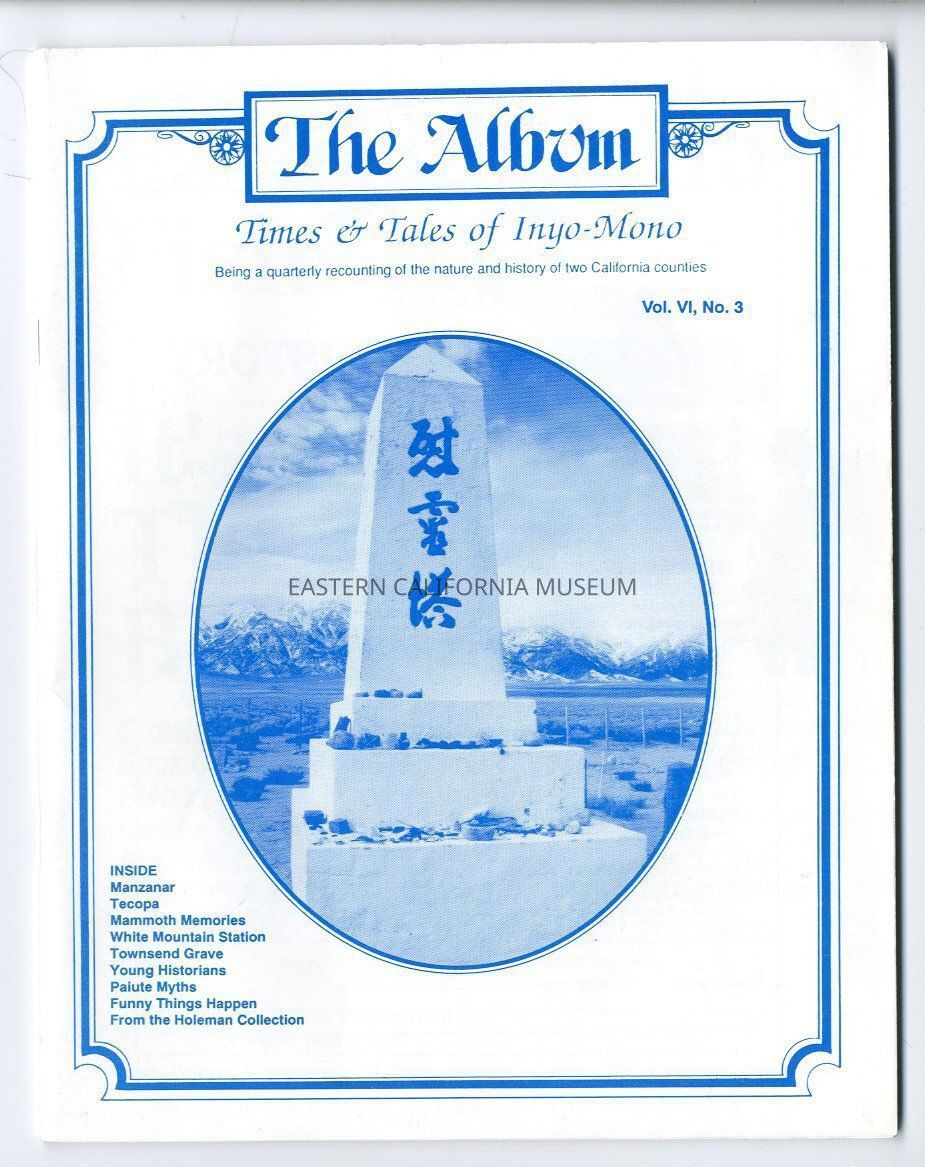 "The Album, Vol. 6, No. 3, Summer 1993" contains the following articles: Manzanar Outside Looking In, Manzanar a Life Story, Tecopa and Tecopa Hot Springs, Growing Up in Mammoth, White Mountain from Prehistory to Space, Townsend Grave Old Mammoth, Young Historians Lon Chaney, Cattle Ranching in Inyo County, Paiute Myths from Julian H. Steward's Paiute Ethnology, A Funny Thing Happened on the Way to the Woods, and Excerpts from the Holeman Collection Burton Fraser Photos.Publication Details