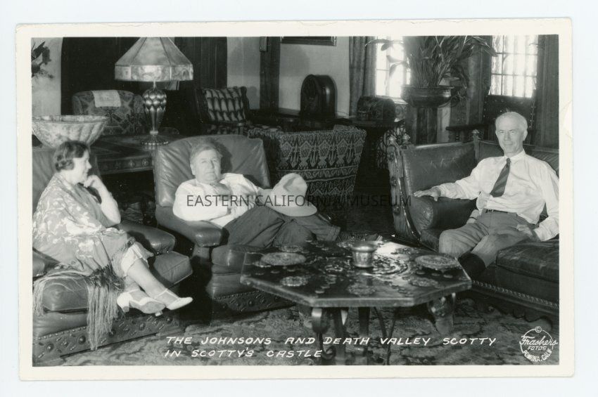 Photo postcard of Death Valley Scotty and the Johnsons relaxing inside of Scotty's Castle.
