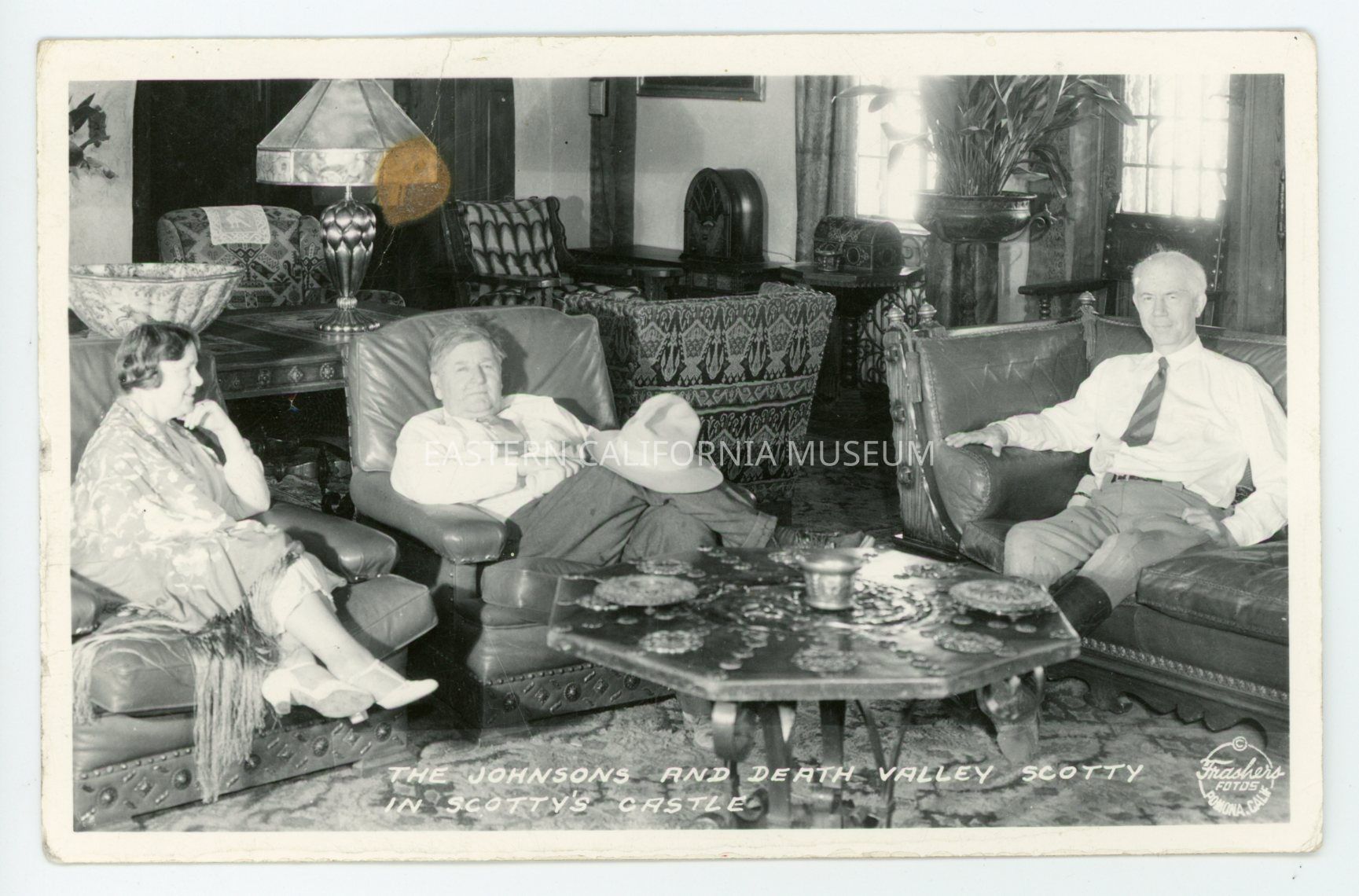 Photo postcard of Death Valley Scotty and the Johnsons sitting in chairs and couches in Scotty's Castle. Photo is titled, "The Johnsons and Death Valley Scotty in Scotty's Castle," and the photographer was Burton Frasher of Pomona, CA.