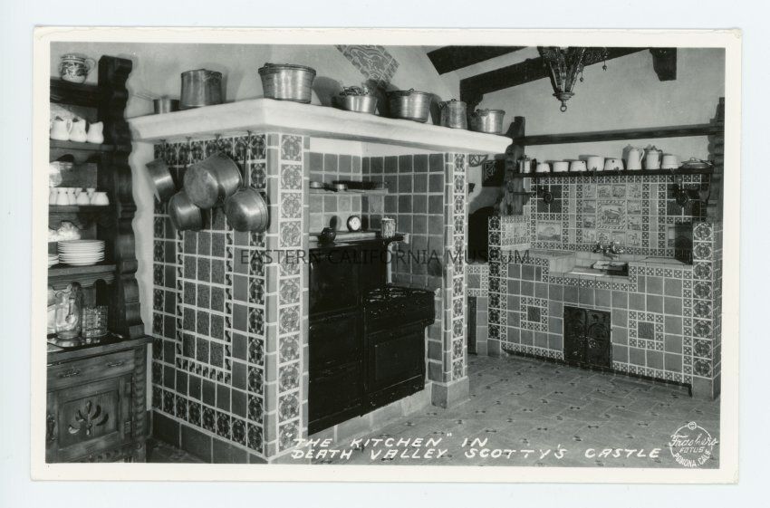 Photo postcard of Death Valley Scotty's Castle. It is labeled, "The Kitchen in Death Valley Scotty's Castle."