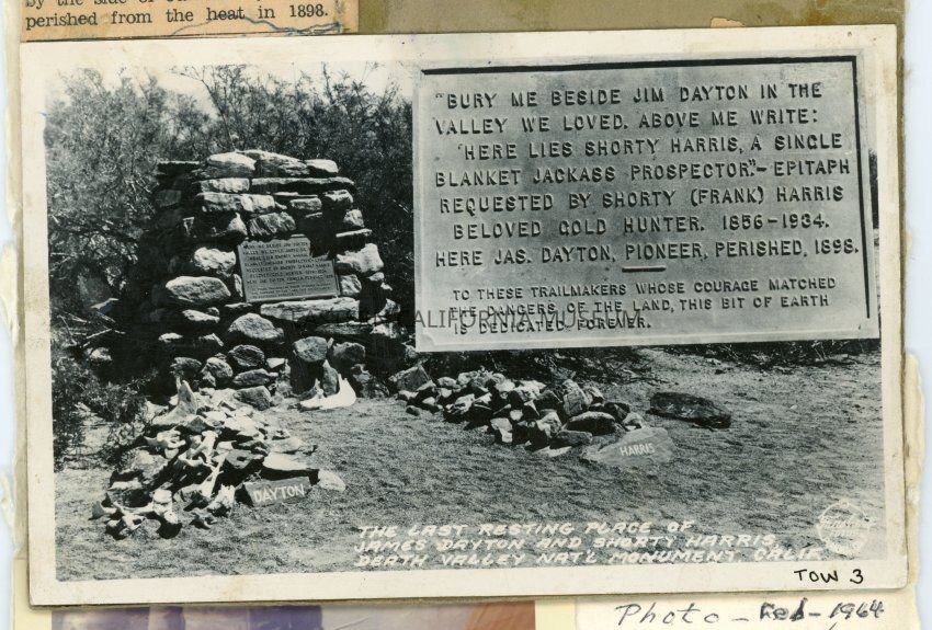 Photo of the graves of James Dayton and Shorty Harris in Death Valley. An insert of the plaque reads: Bury me beside Jim Dayton in the valley we loved. Above me write: Here lies Shorty Harris, a single blanket jackass prospector. Epitaph requested by Shorty (Frank) Harris beloved gold hunter. 1856-1934. Here Jas. Dayton, Pioneer, perished, 1898. To these trailmakers whose courage matched the dangers of the land, this bit of earth is dedicated forever.