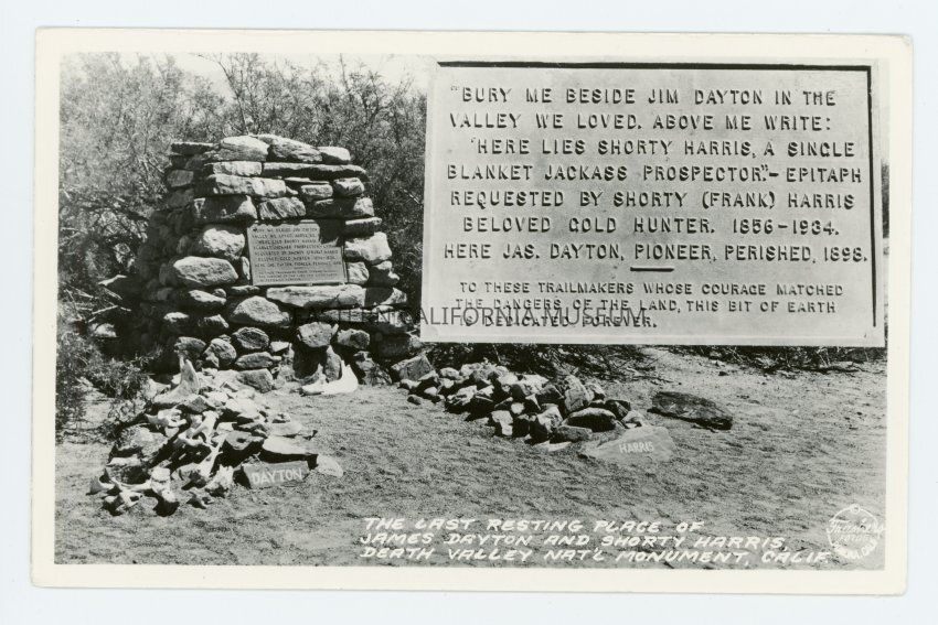 A stone marker and plaque with the graves says, "Bury me beside Jim Dayton in the valley we loved. Above me write: Here lies Shorty Harris, a single blanket jackass prospector. Epitaph requested by Shorty (Frank) Harris, beloved gold hunter. 1856-1934. Here Jas. Dayton, pioneer, perished, 1898. To these trailmakers whose courage matched the dangers of the land, this bit of earth is dedicated forever."Collection