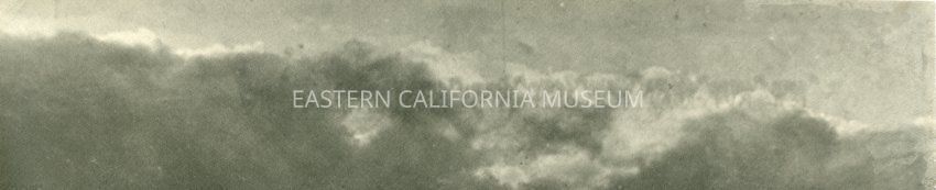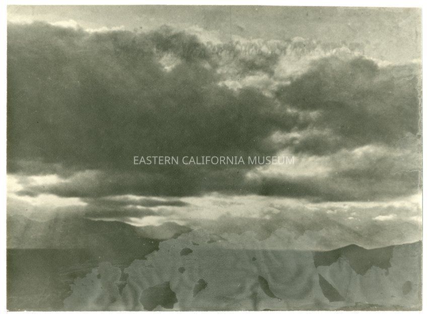 Photograph titled, "The Mirage." Photo makes it look like a 20 mule team is walking in the clouds (top center). It was taken in the Armargosa Desert in November 1905. Bottom of the photo has been water damaged.Collection