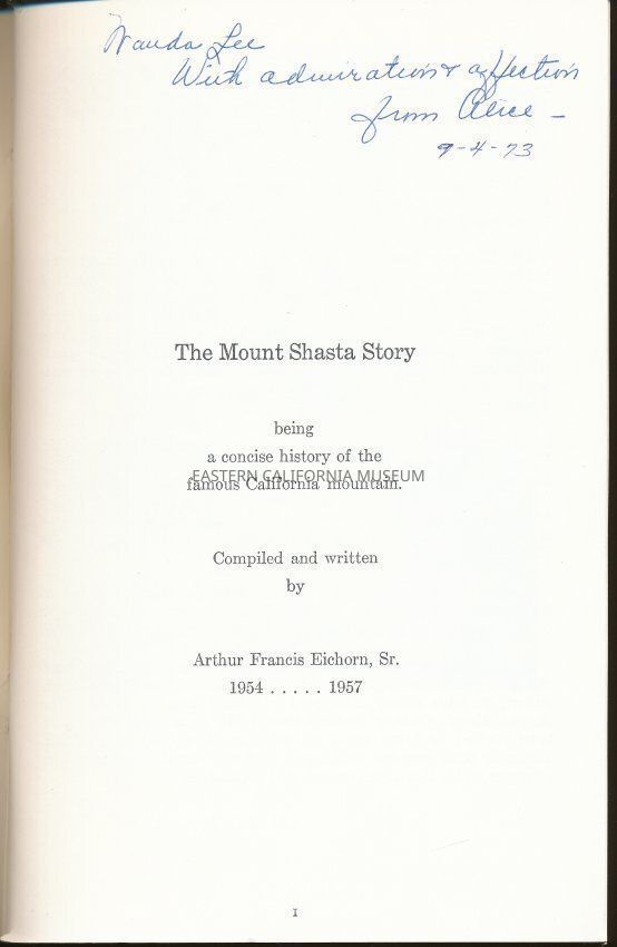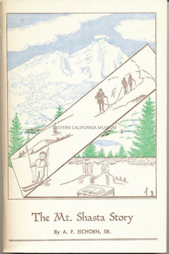 History of Mt Shasta including legends and occult aspects. The cover shows the mountain in the background with green pine at the base and an angled strip with brown figures of which the top portion and 3 climbers attached to each other by a rope. Below them is a child on skis holding a pair of large ski poles. The title is at the base of page in brown ink.
