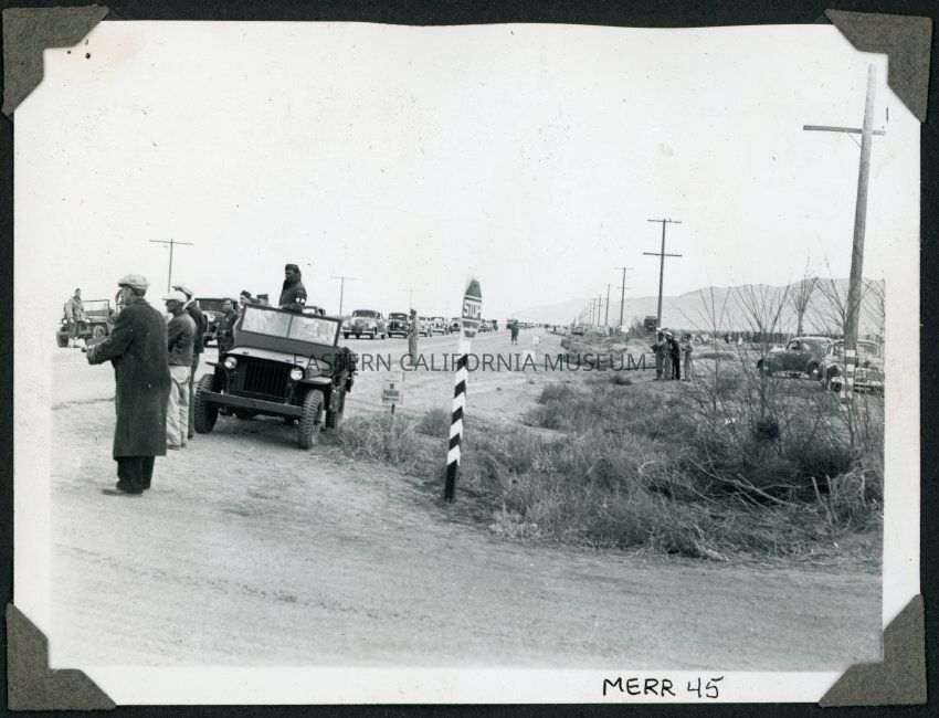 Photograph of "the reception committee" for the first group of incarcerees arriving in a line of cars stretching in the distance. In the background the Alabama Hills are visible. In the foreground are several groups observing the arrival including military police. Caption reads: Reception committee, March 23, 1942. Title from caption, which was taken from the original photo album.Collection