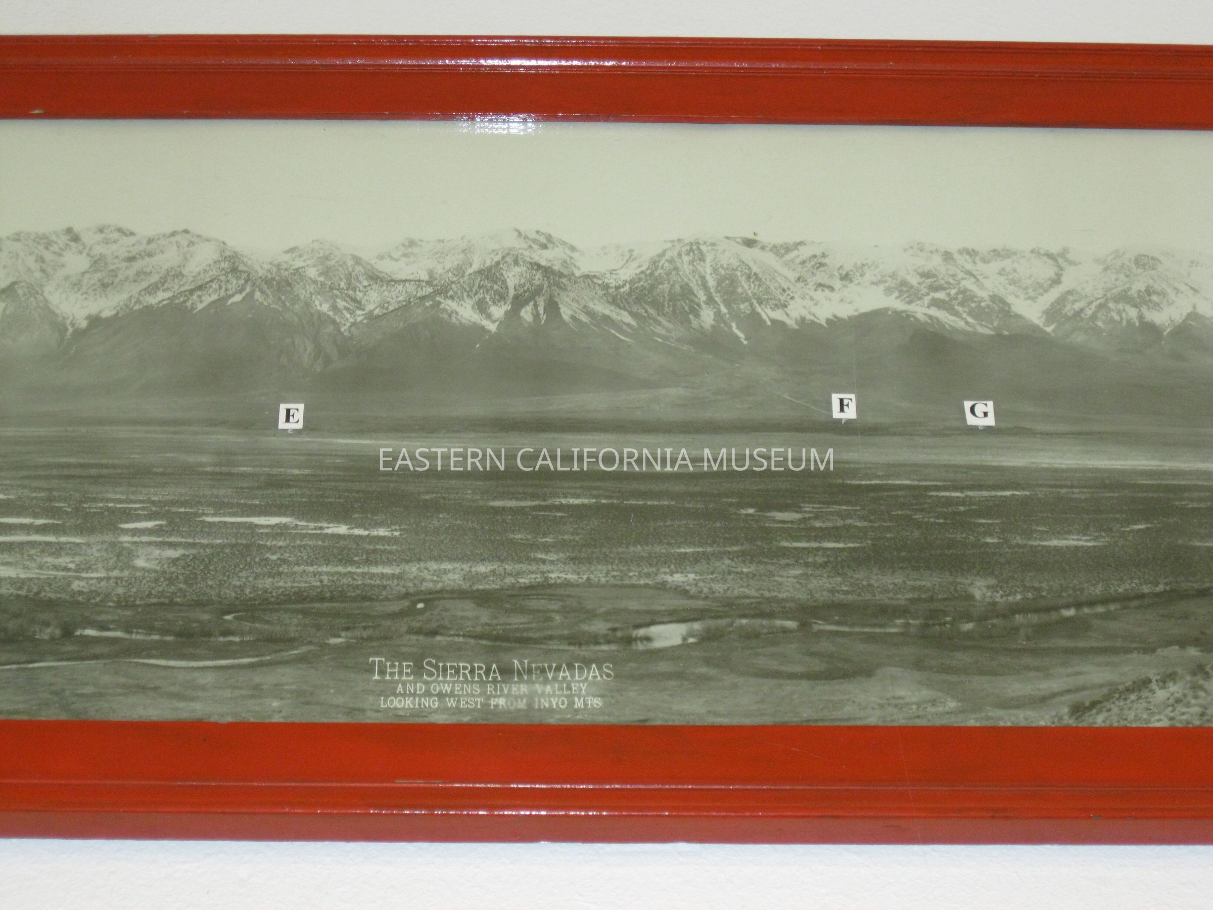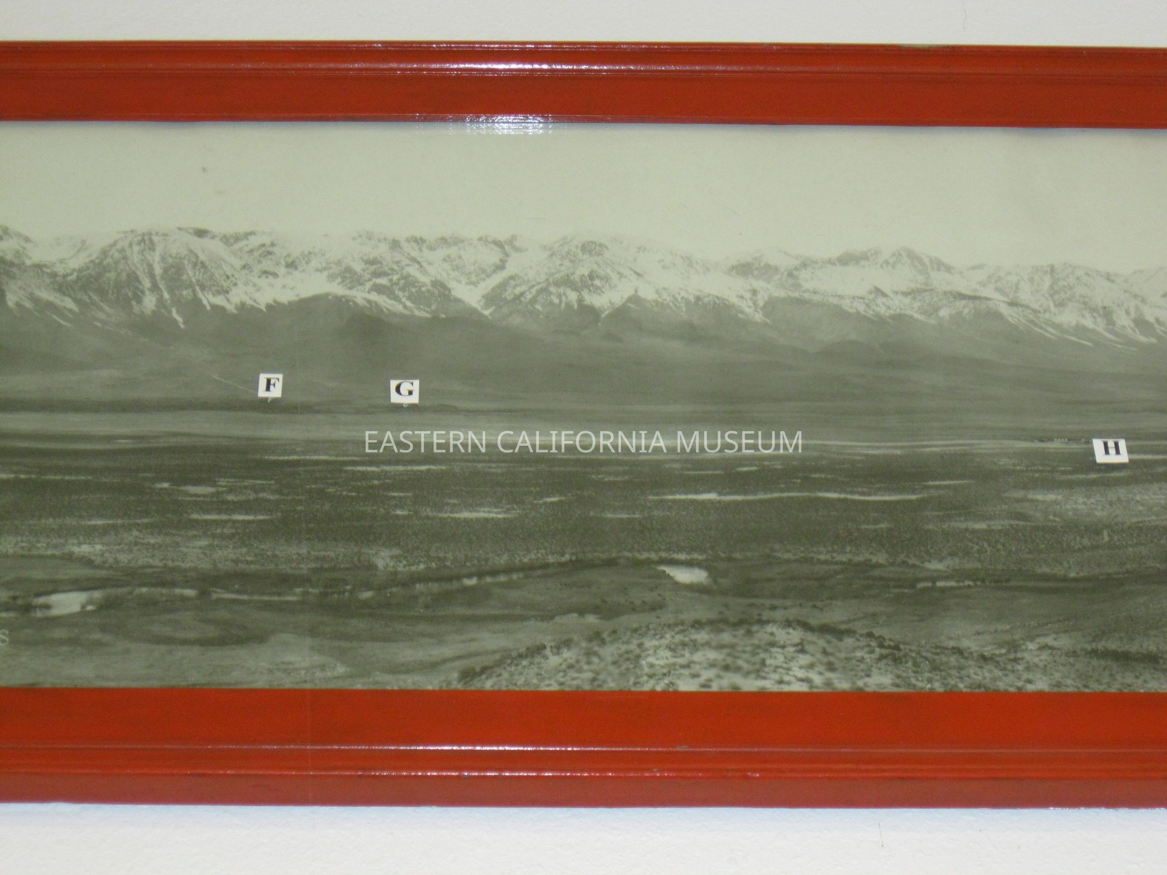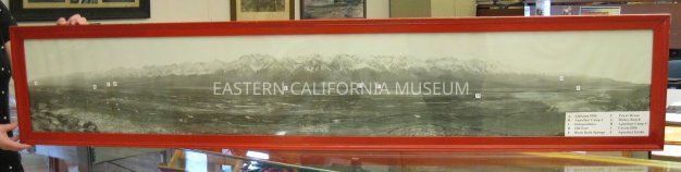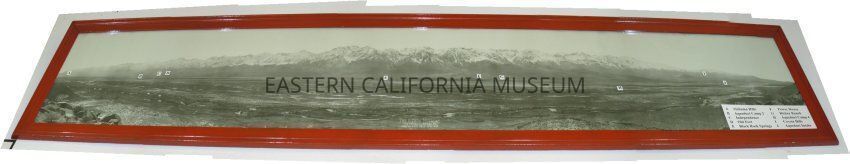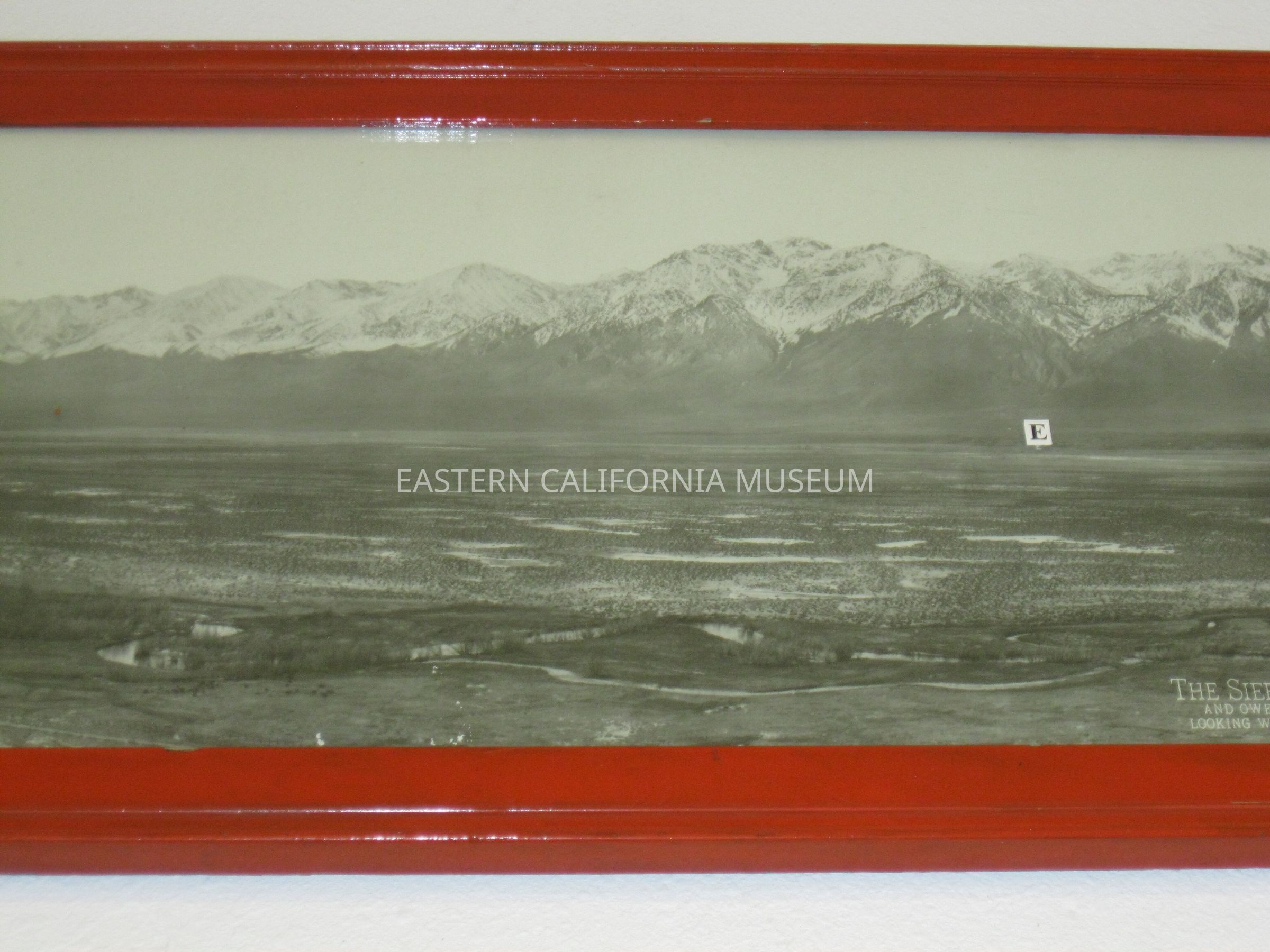 Framed panoramic photo of the Sierra Nevada taken from the Inyo Mountains encompassing Poverty Hills and south of Independence. This photograph hung over the piano in the lobby of the Hotel Independence when A. Loren and Mary Williams, parents of Art Williams, bought the hotel from the Levys in early 1944. The Williams owned the hotel until early in 1946.Collection