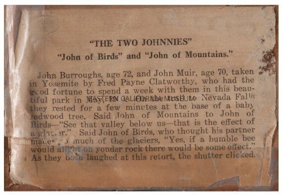 Information taken from Cowan's Auctions: A fine photo capturing American naturalist, John Burroughs, age 72, and Scottish American Geologist John Muir, age 70, taken in Yosemite by Clatworthy, who had the opportunity to spend a week with the men at the park in May, 1909. On the trail to Nevada Falls, the "Two Johnnies" rested for a few minutes at the base of a baby redwood tree.Collection