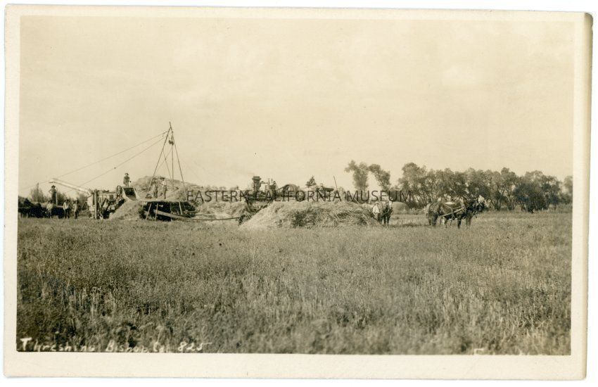 Photo postcard labeled, "Threshing, Bishop, Cal." and likely taken by photographer A. A. Forbes and given his ID #825.