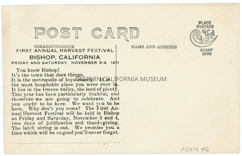 It is the metropolis of Inyo county. It is the most hospitable place you were ever in. It lies in the Owens valley, the land of plenty. This year has been particularly fruitful, and therefore we are going to celebrate. And you ought to be here. We want you to be here. Why don't you come? The First Annual Harvest Festival will be held in Bishop on Friday and Saturday, November 3 and 4, two days of jollification and thanksgiving. The latch string is out. We promise you a time which will be so good you'll never forget.