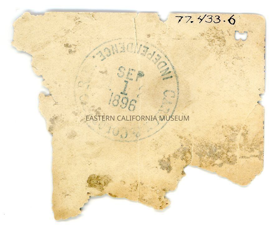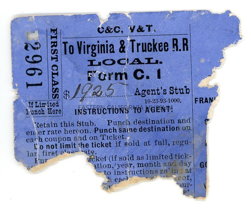 Badly damaged ticket stub, purple or blue in color. It is first class ticket #2961 with a punch. It says, "C&C, V&T, to Virginia & Truckee R.R. Local., Form C. 1, $1925 Agent's Stub. 10-23-93-1000." It is stamped on reverse with "Carson & Colorado R. R., Independence, Sep. 1, 1896."