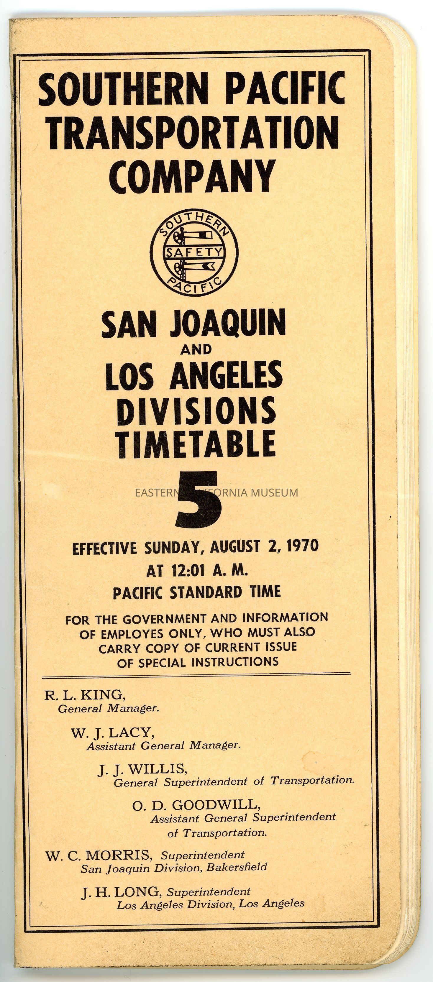 Southern Pacific Transportation Company San Joaquin and Los Angeles Divisions Timetable #5, effective Sunday, August 2, 1970 at 12:01 AM Pacific Standard Time.