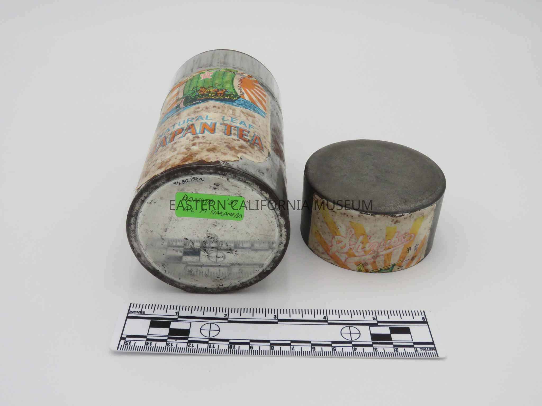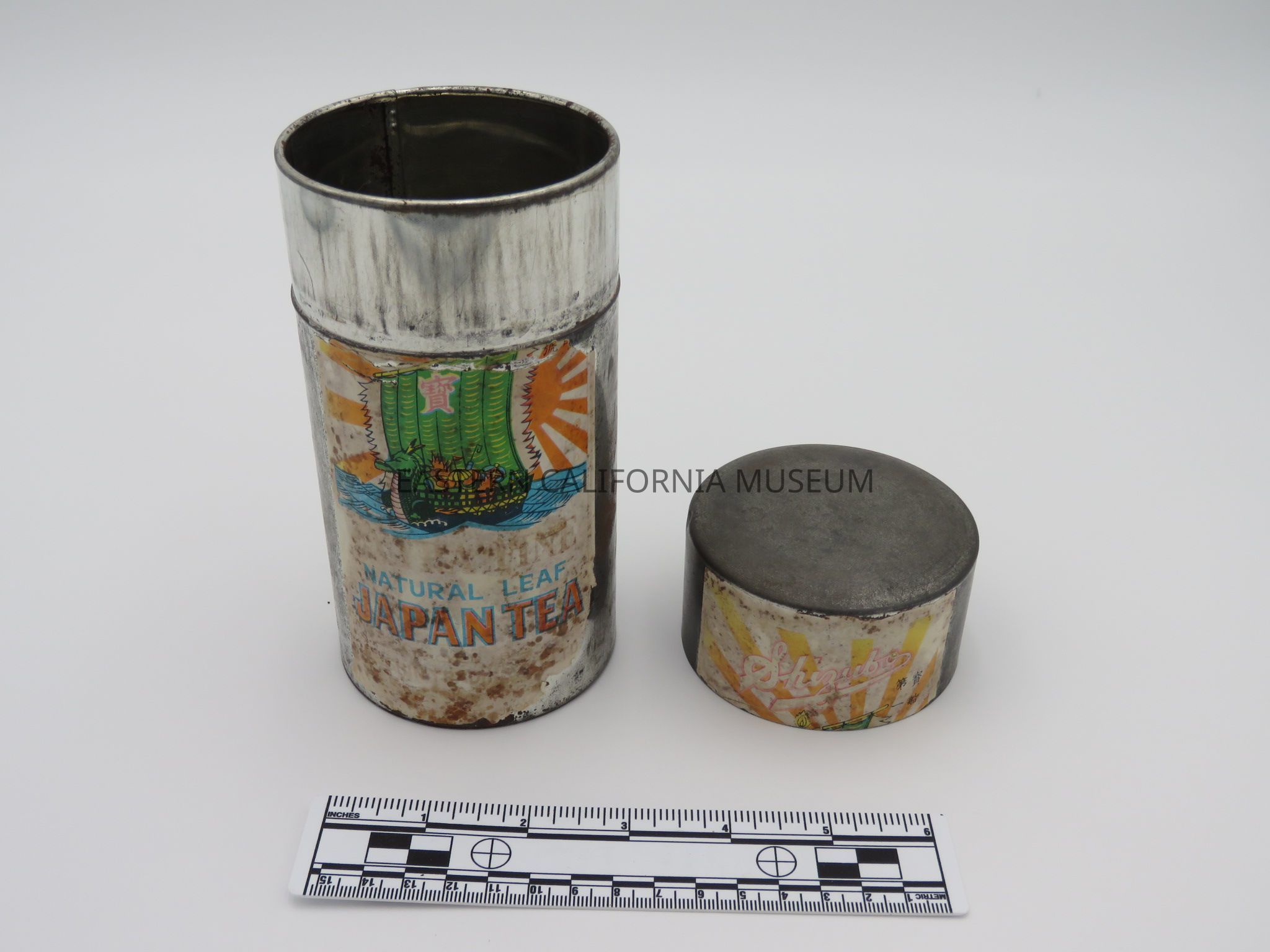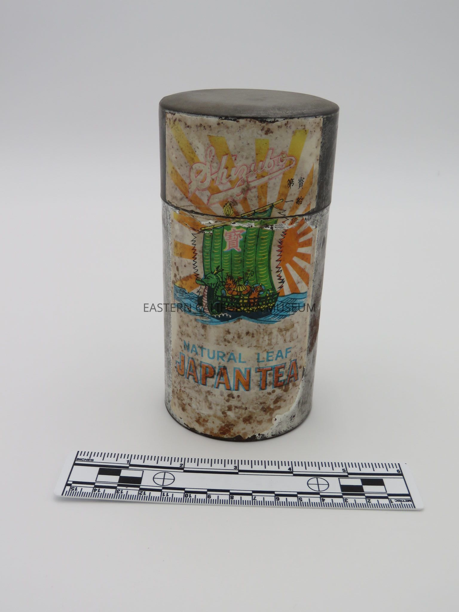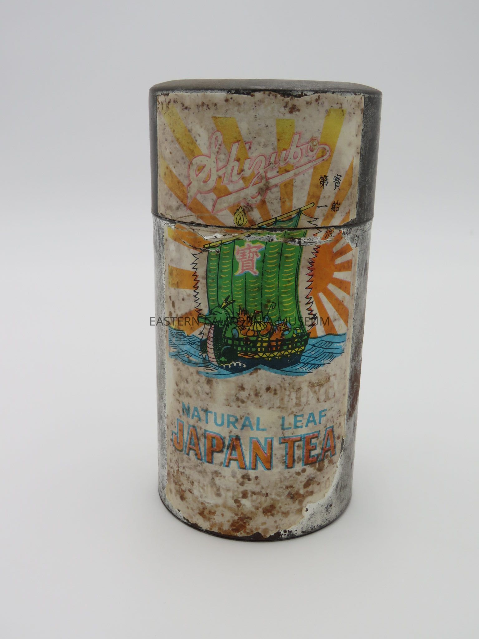 Japanese tea tin and lid with a bright, colorful label still affixed. The label says, "Shizubo Natural Leaf Japan Tea" and has a picture of a dragon boat with a green sail. It was likely used at Manzanar War Relocation Center.