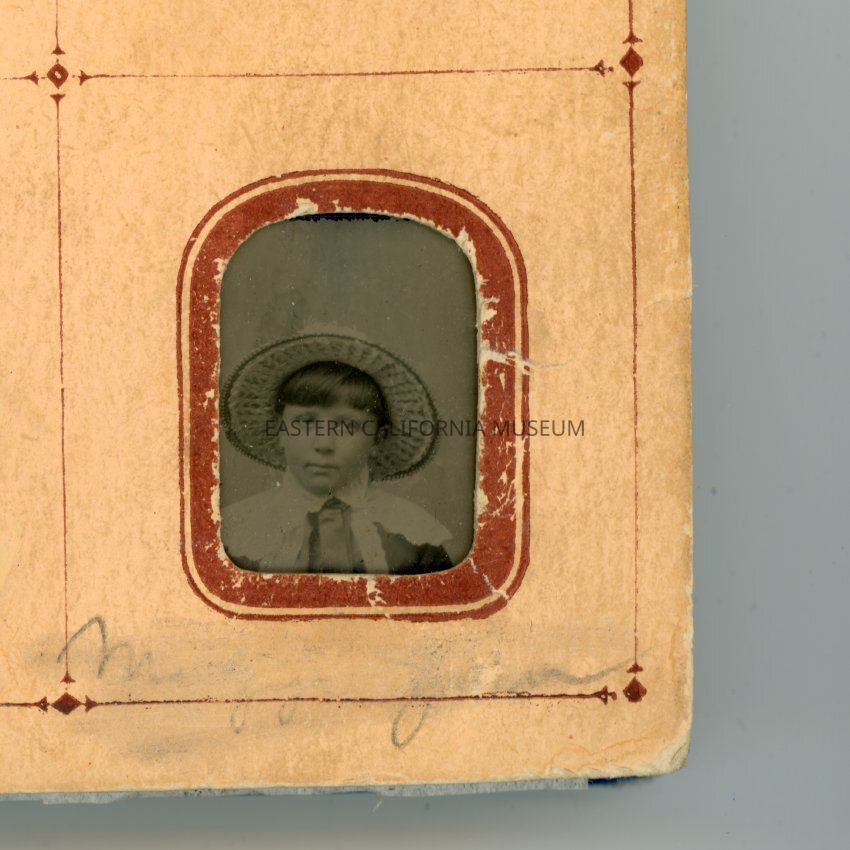 Small tintype of a young child wearing a hat. There was a name written beneath it, but it has been smudged or erased. It looks like the initials may have been M. J. or maybe M. Meysan?Collection