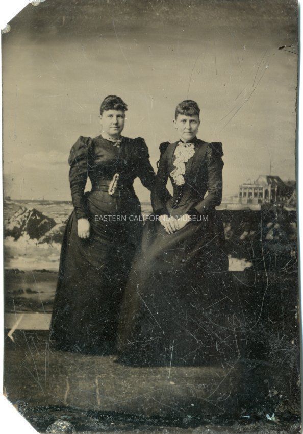 Tintype of two woman standing in front of a studio backdrop of the Pacific Ocean and Cliff House, San Francisco. Mary Olive Calvert of Aberdeen is on the left.Photograph Details