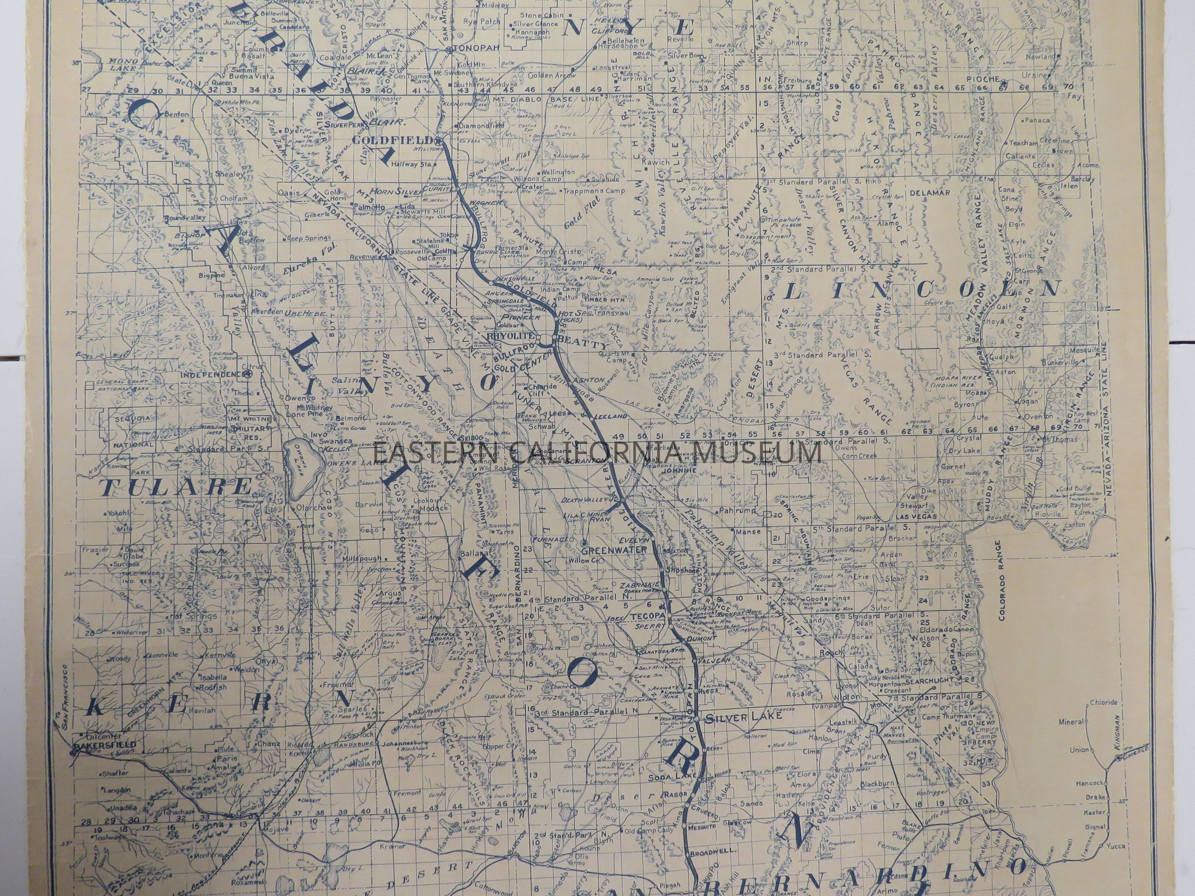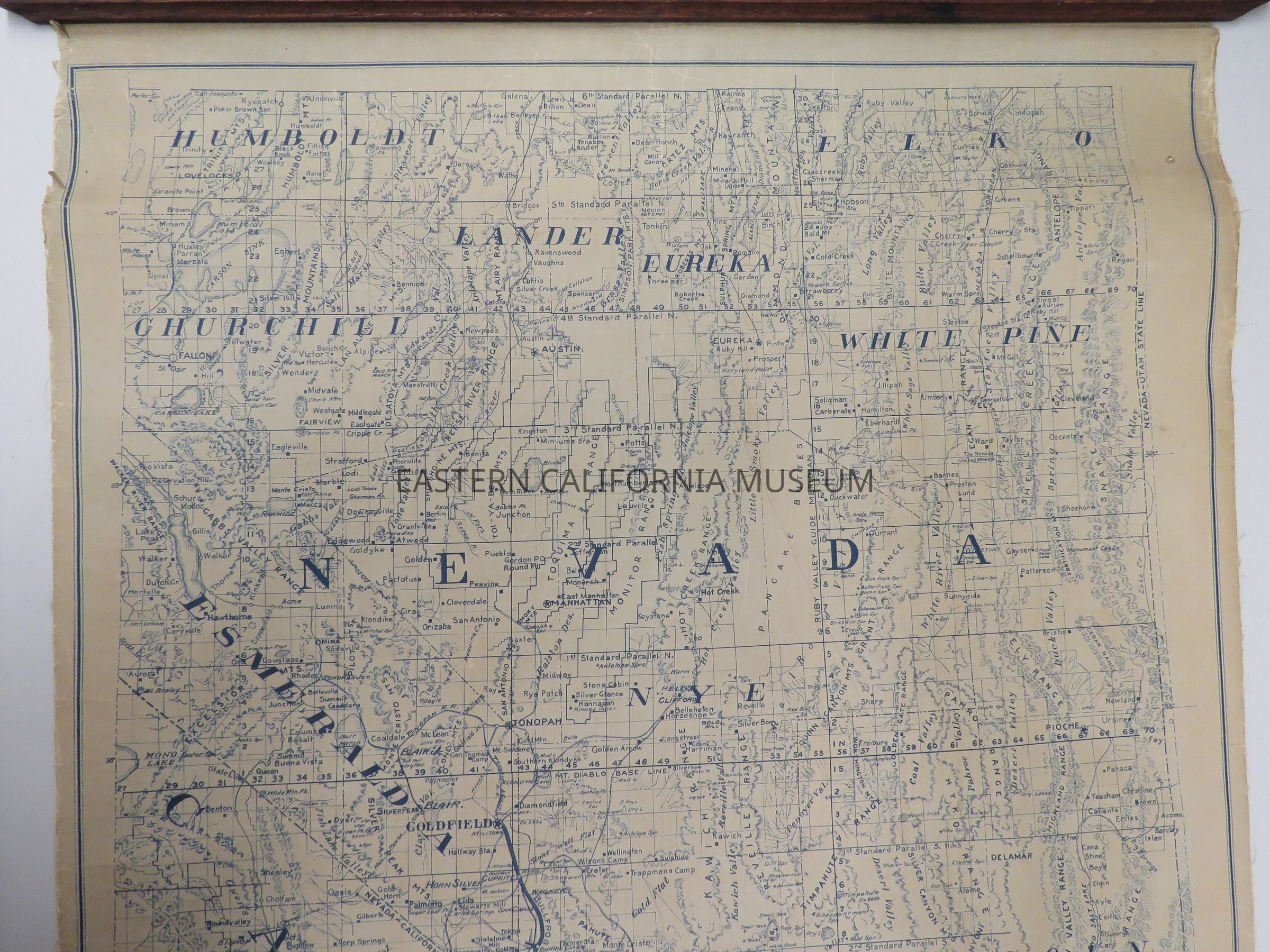 Map is mounted on a linen backing with wooden dowels at top and bottom for hanging on a wall. It shows railroad lines (including the Southern Pacific in the Owens Valley), towns, mines, lakes, and geologic features.