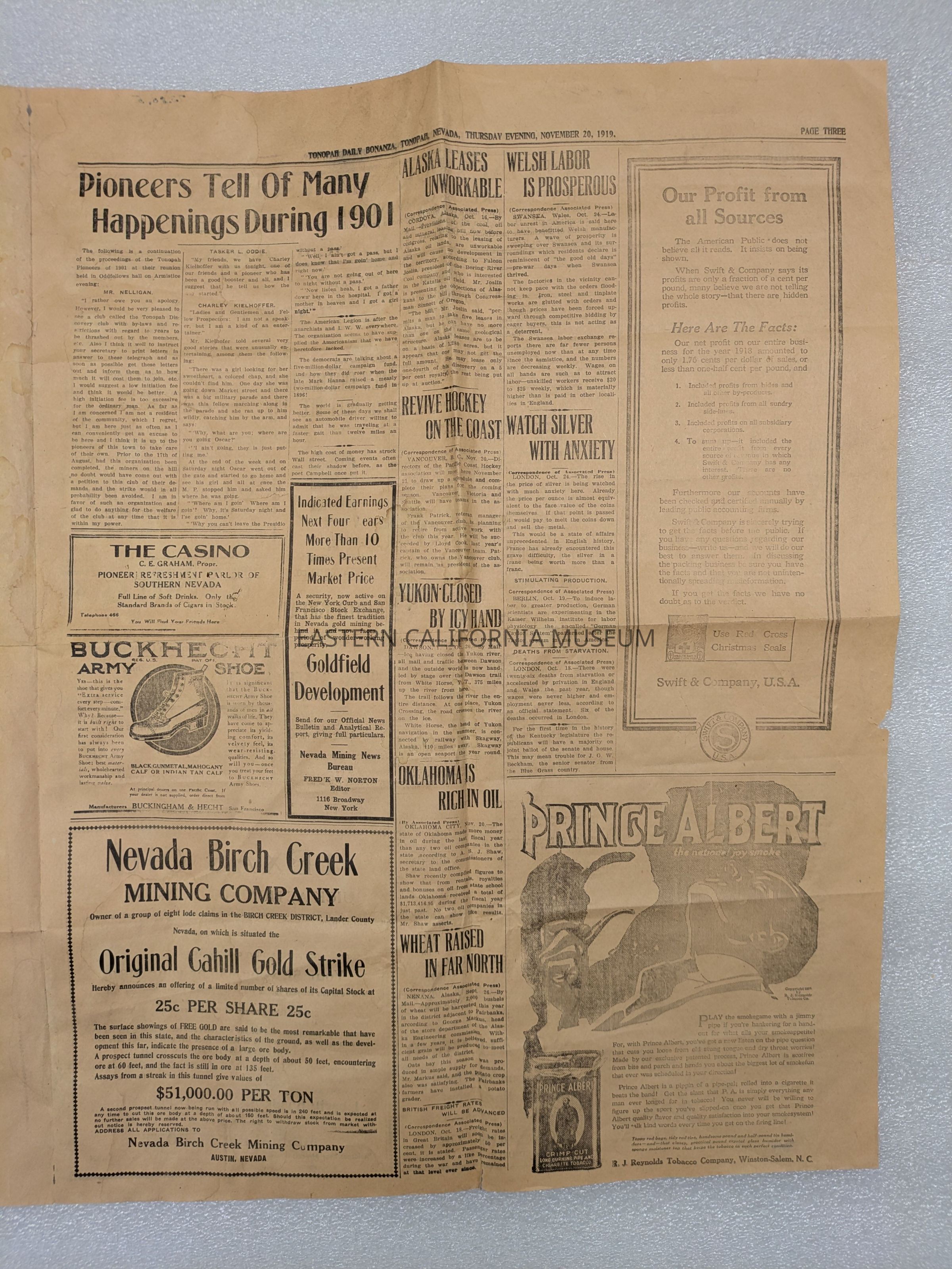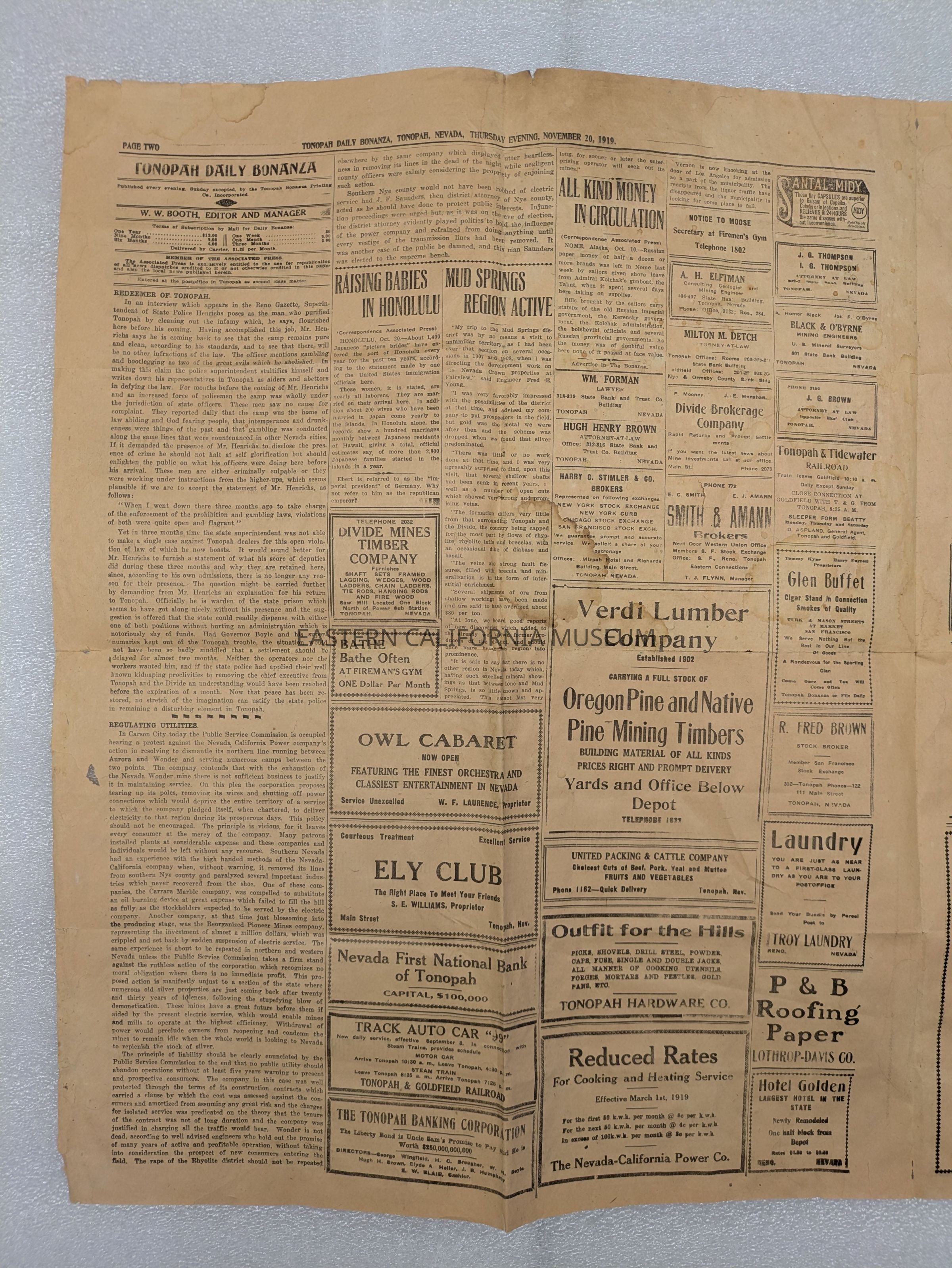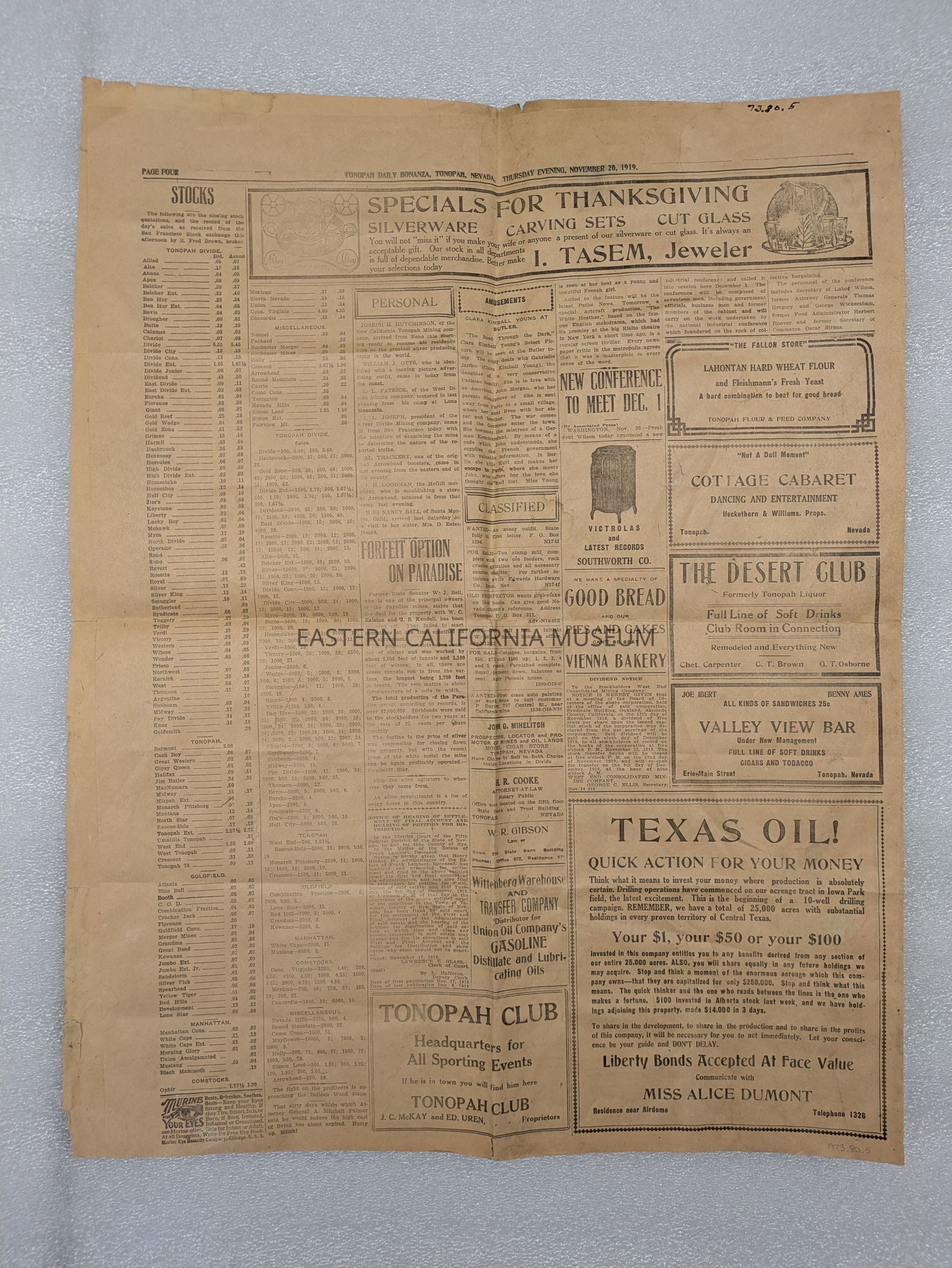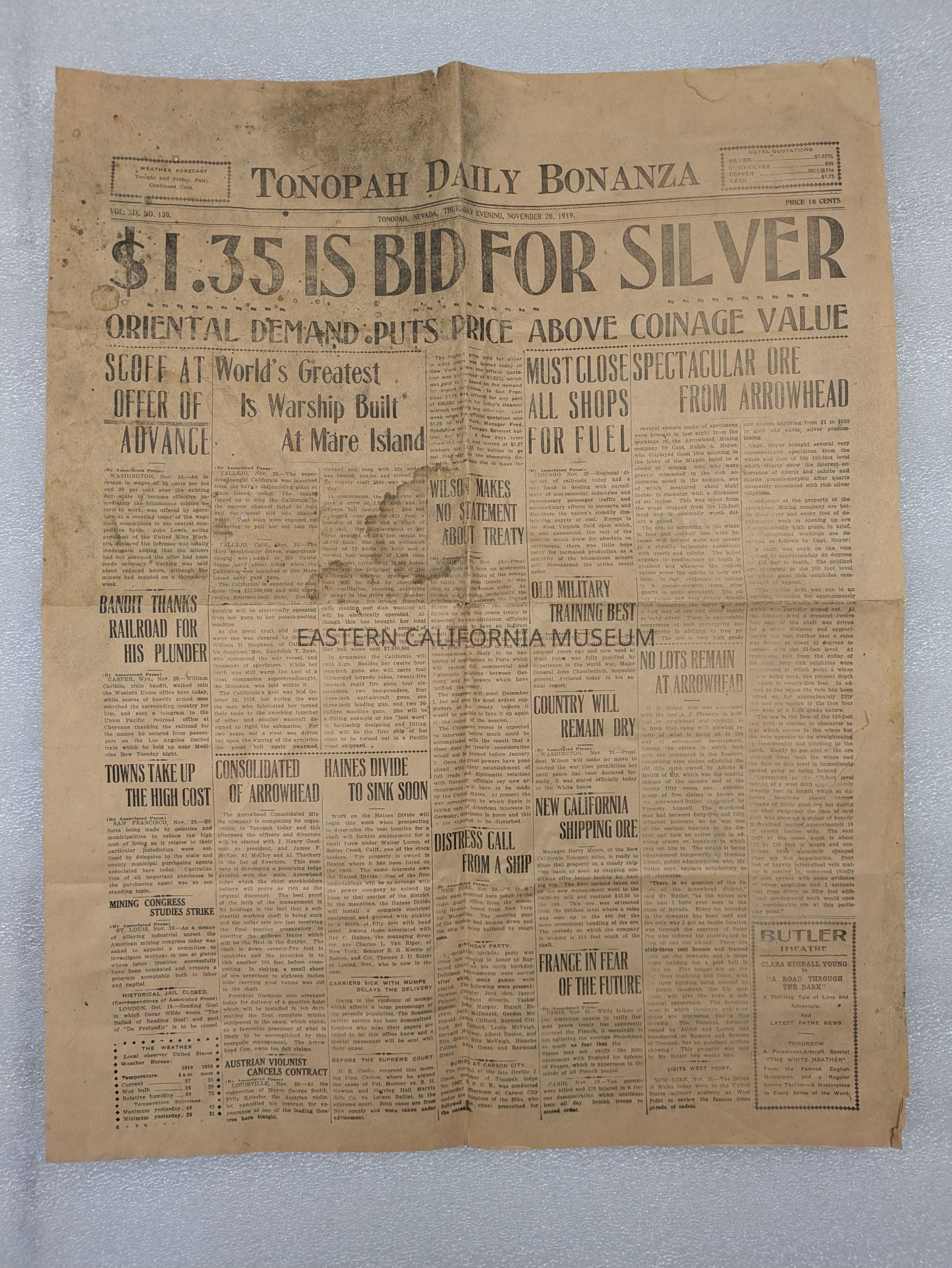 Newspaper: Tonopah Daily Bonanza, Vol.l XIX, No. 130, November 20, 1919.Collection