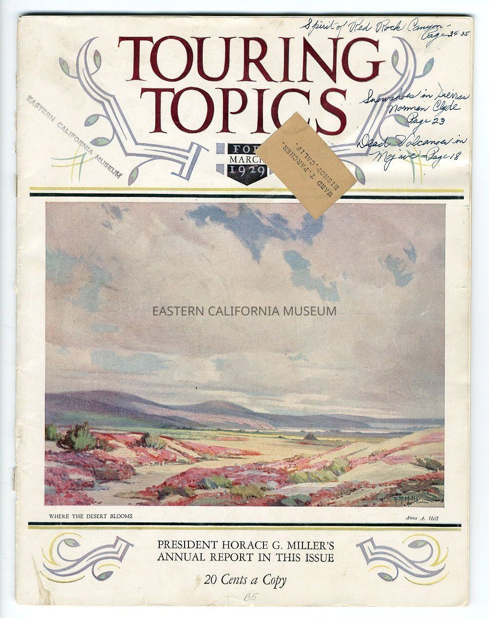 "Touring Topics, Vol. XXI, No. 3, March 1929" contains articles titled "Dead Volcanoes of the Mojave" and "On Snowshoes in the Sierra," by Norman Clyde. A label affixed to front cover says "Ward T. Parcher / Bishop, Calif." Cover is detached.Publication Details
