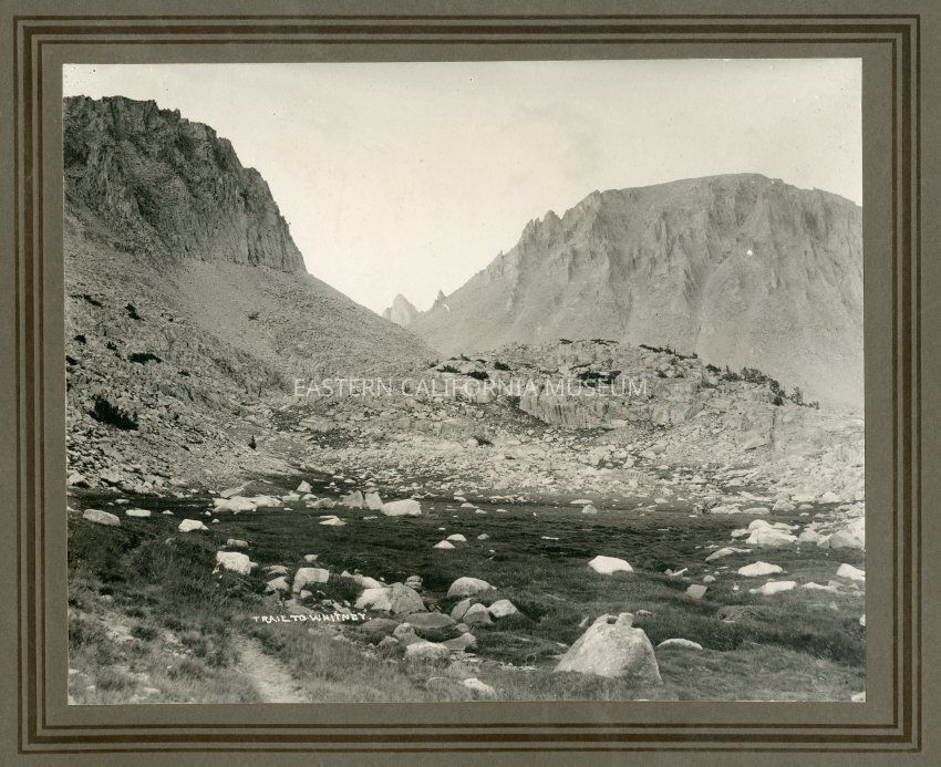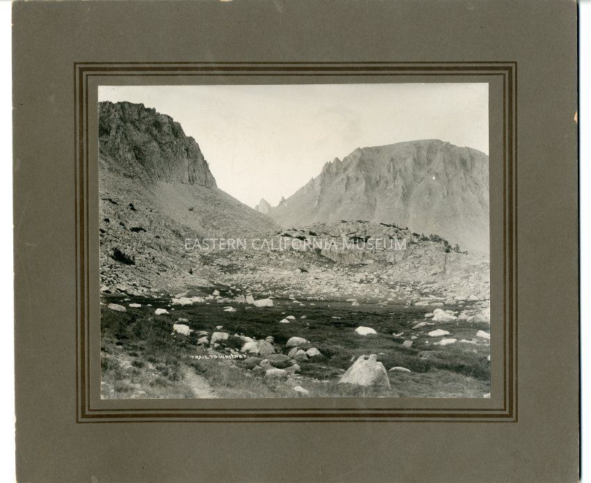 Mounted photograph titled, "Trail to Whitney." Shows a flat meadow area and then two rocky mountainsides with the tip of a peak (Whitney) in the center.