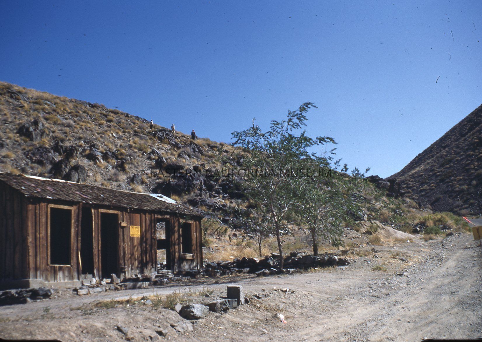 Color Kodachrome transparency of the abandoned Westgard Pass toll house in September 1953 from Babe Hopper.