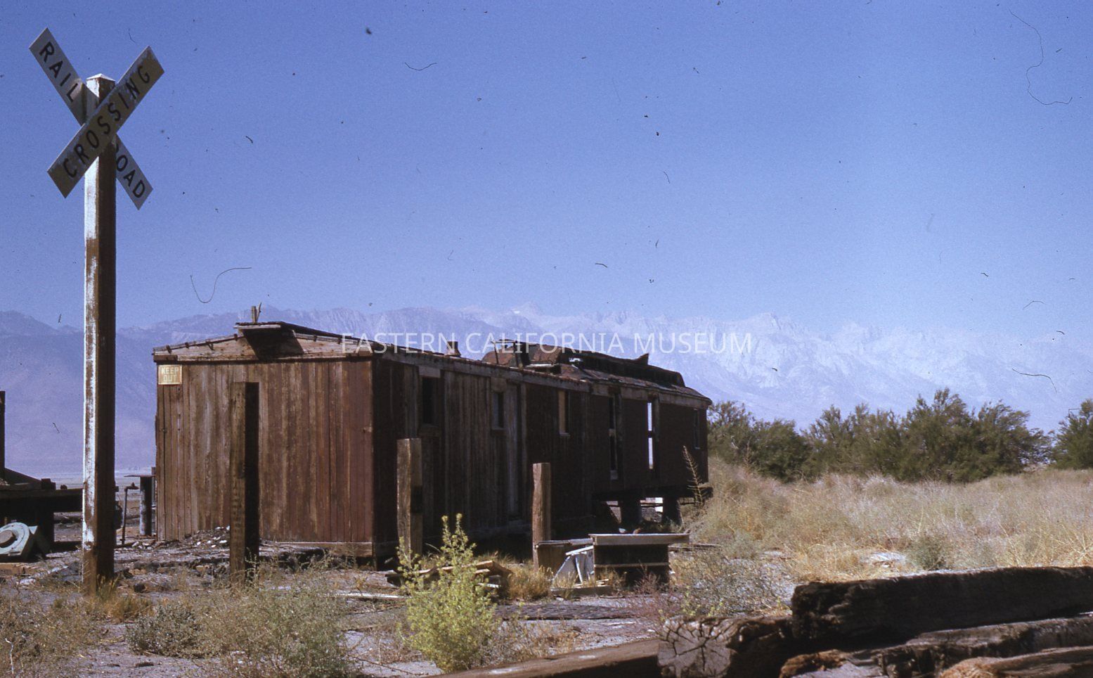 Color Kodachrome transparency of a railroad car in disrepair at Keeler on 09/28/1974. There is a white and black railroad crossing sign on the left side.Collection