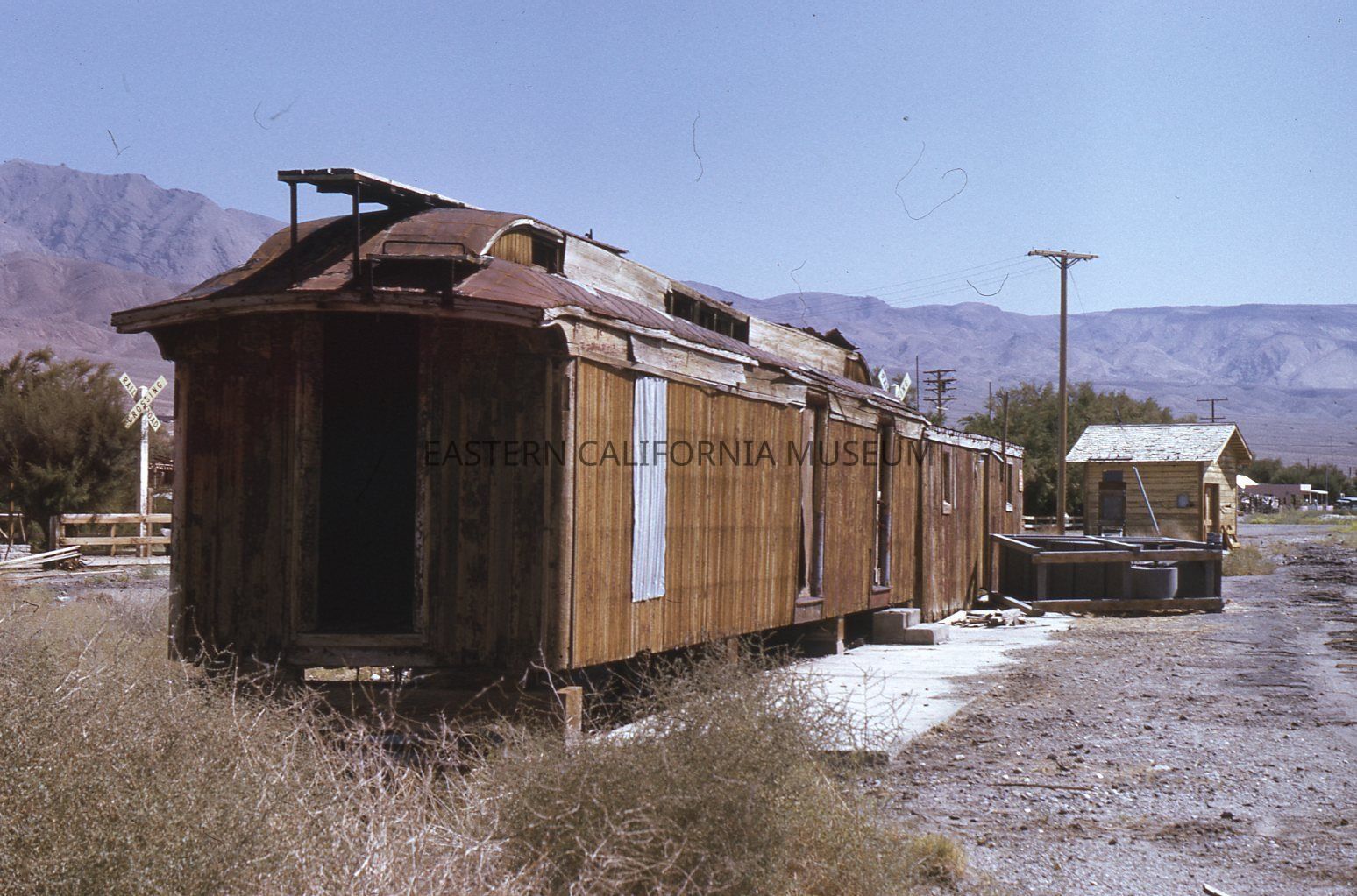 Color Kodachrome transparency of a railroad car in disrepair at Keeler on 09/28/1974. It is on concrete blocks with two steps leading up to the door.Collection