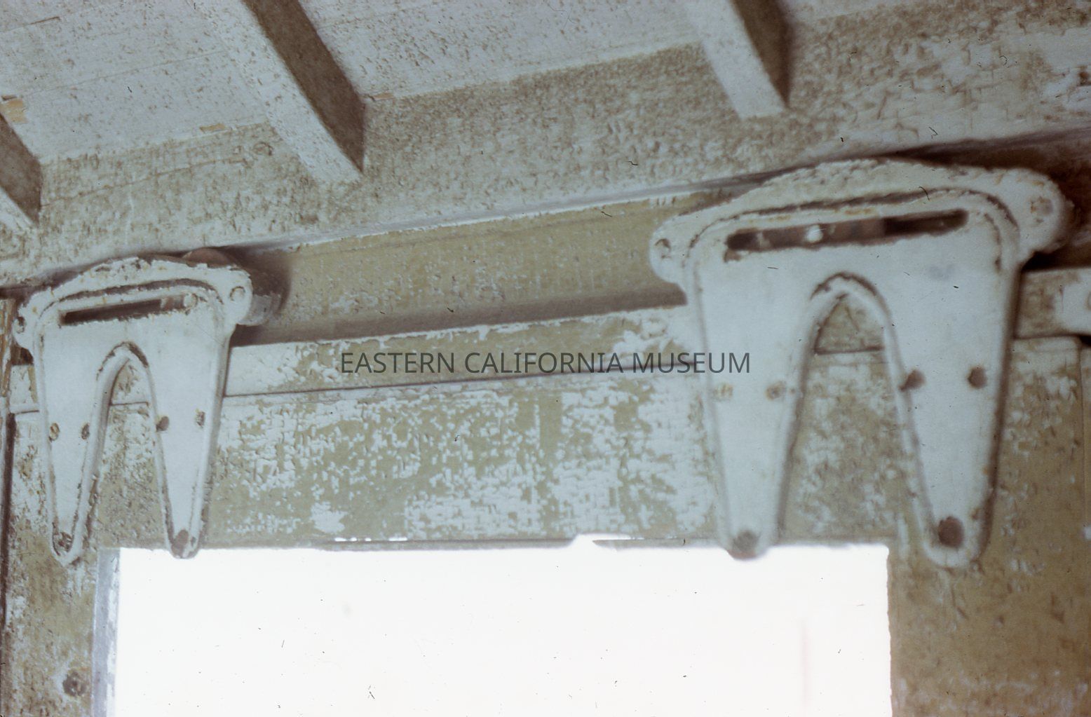 Color Kodachrome transparency of the metal hardware above a window in a railroad car. The slide is labeled, "Coach interior, Keeler, Cal."