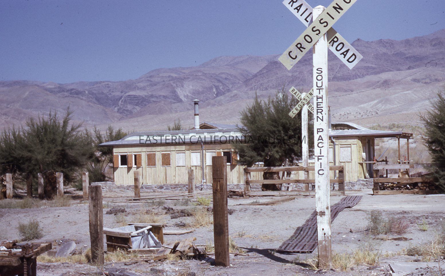 Color Kodachrome transparency of a railroad car that has been converted into a house. There are two white and black railroad crossing signs, and the one in the foreground also has "Southern Pacific" written on its post. The slide is labeled, "Mr. Payne's residence, Keeler, Cal."