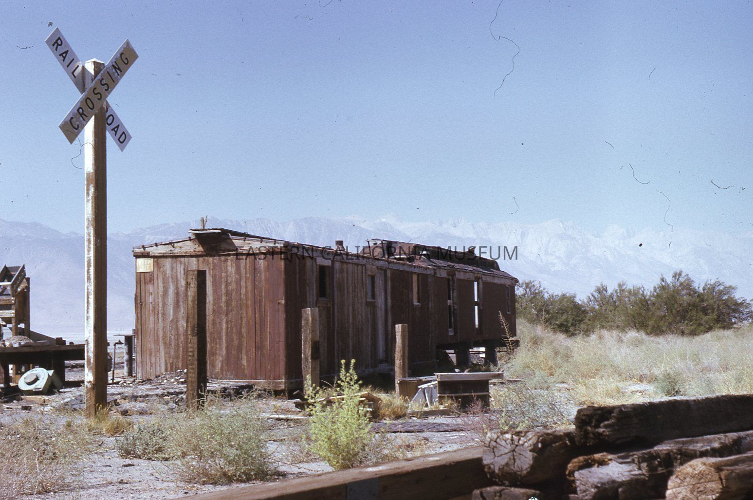 Color Kodachrome transparency of a railroad car in disrepair at Keeler on 09/28/1974. There is a white and black railroad crossing sign on the left side.Collection