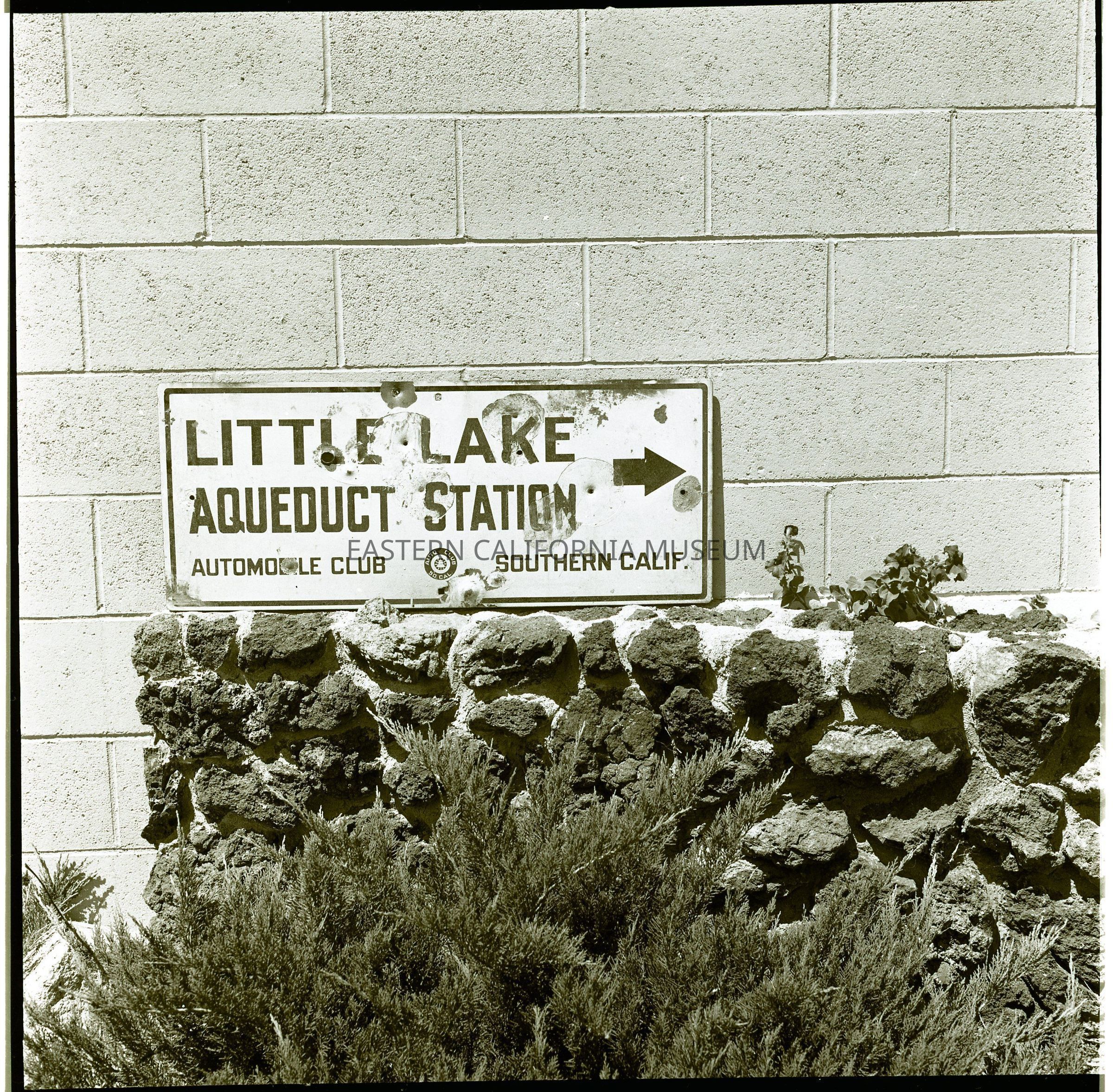 Transparency of a rectangular Automobile Club of Southern California road sign (either 1972.141.1 or 1972.141.2) that says, "Little Lake Aqueduct Station." It is pictured leaning against the exterior wall of the Eastern California Museum.