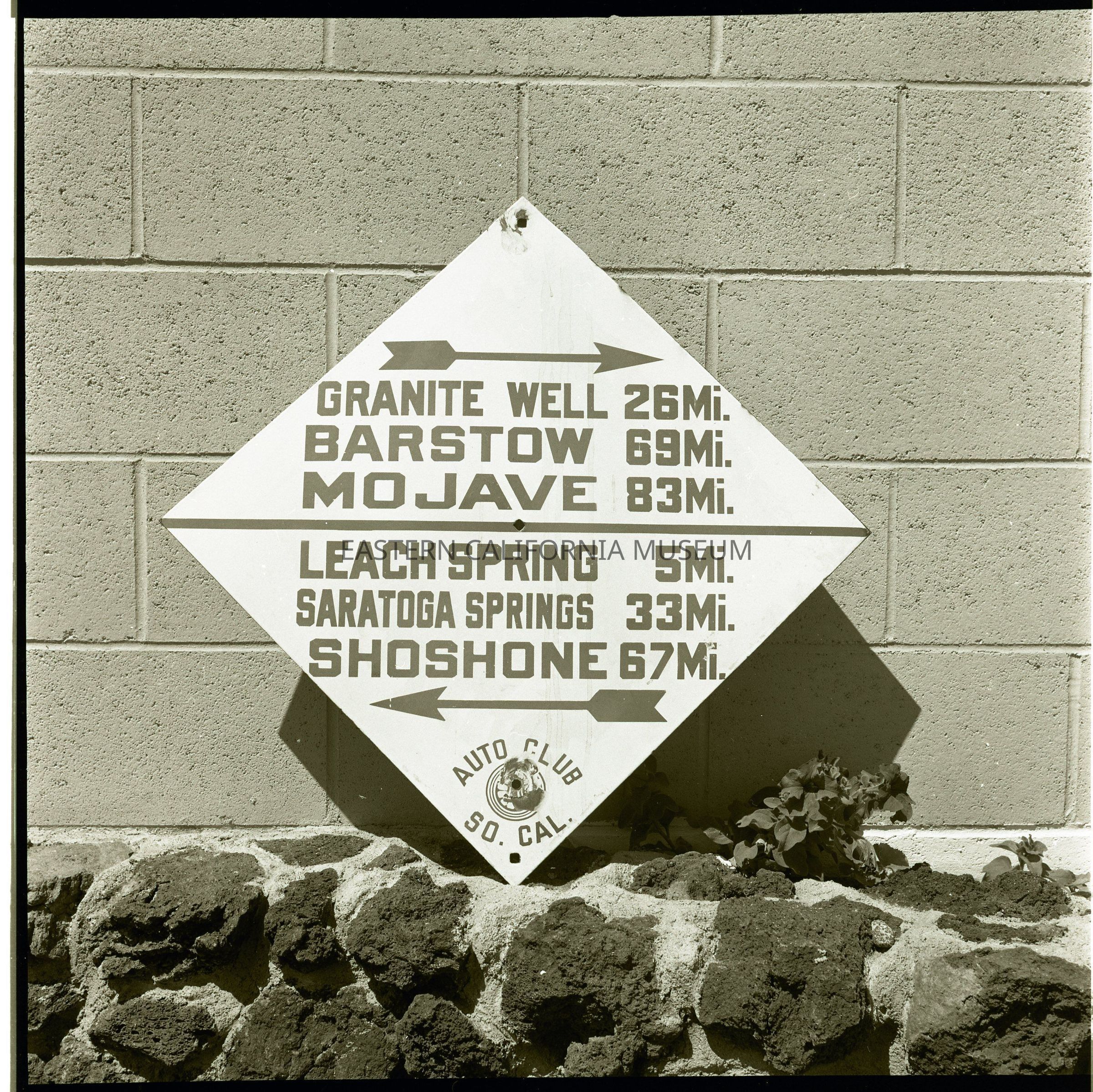 Transparency of a diamond-shaped Automobile Club of Southern California road sign (A798.6) that says, "Granite Well 26 Mi. / Barstow 69 Mi. / Mojave 83 Mi. / Leach Spring 5 Mi. / Saratoga Springs 33 Mi. / Shoshone 67 Mi." It is pictured leaning against the exterior wall of the Eastern California Museum.Photograph Details