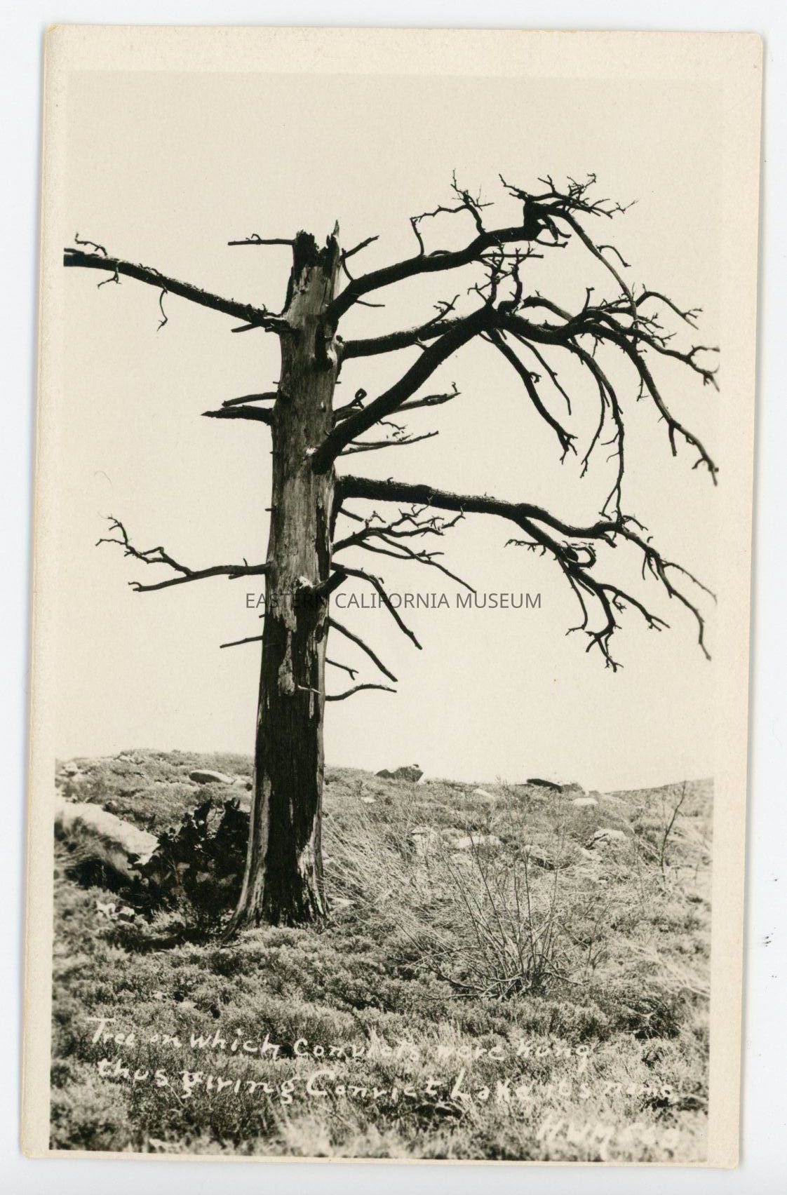 Photo postcard titled, "Tree on which convicts were hung thus giving Convict Lake its name" taken by photographer H. W. Mendenhall and given his ID #565.Collection