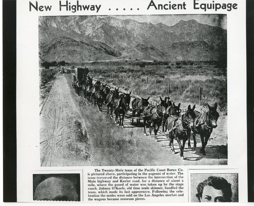 B&W. Photo of newspaper article with headline, "New Highway...Acient Equipage." Photo is of the twenty-mule team of the Pacific Coast Borax Co. during the pageant of water in 1937. Johnny O'Keefe handled the team.